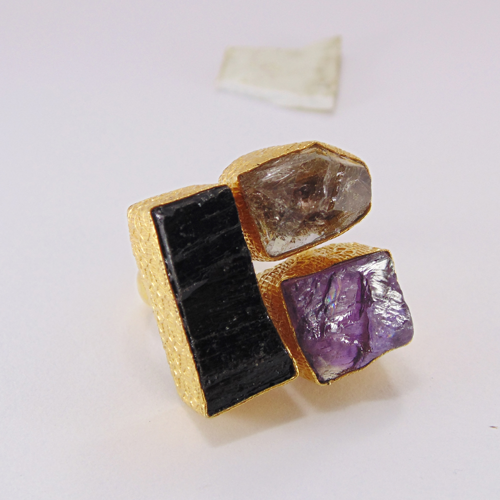 Rough Black Tourmaline Gemstone Gold Plated Fashion Ring Jewelry