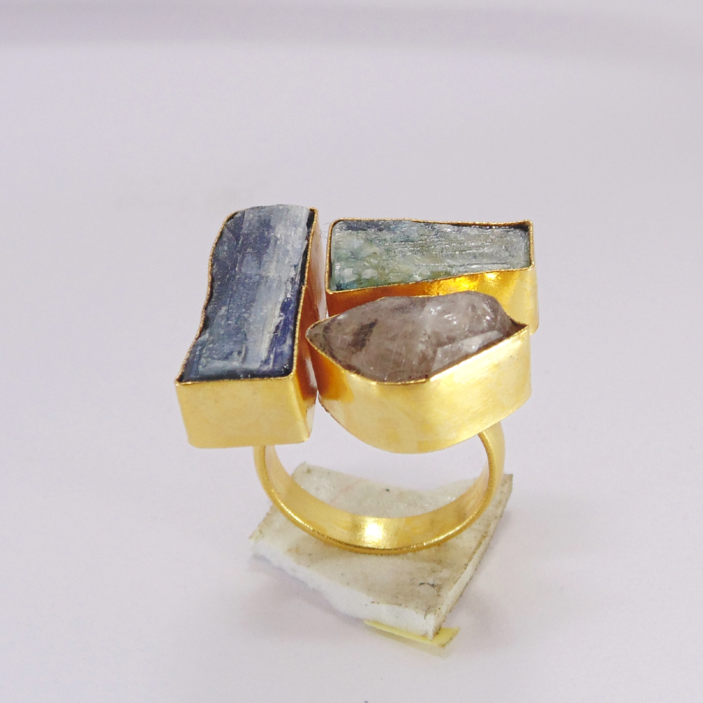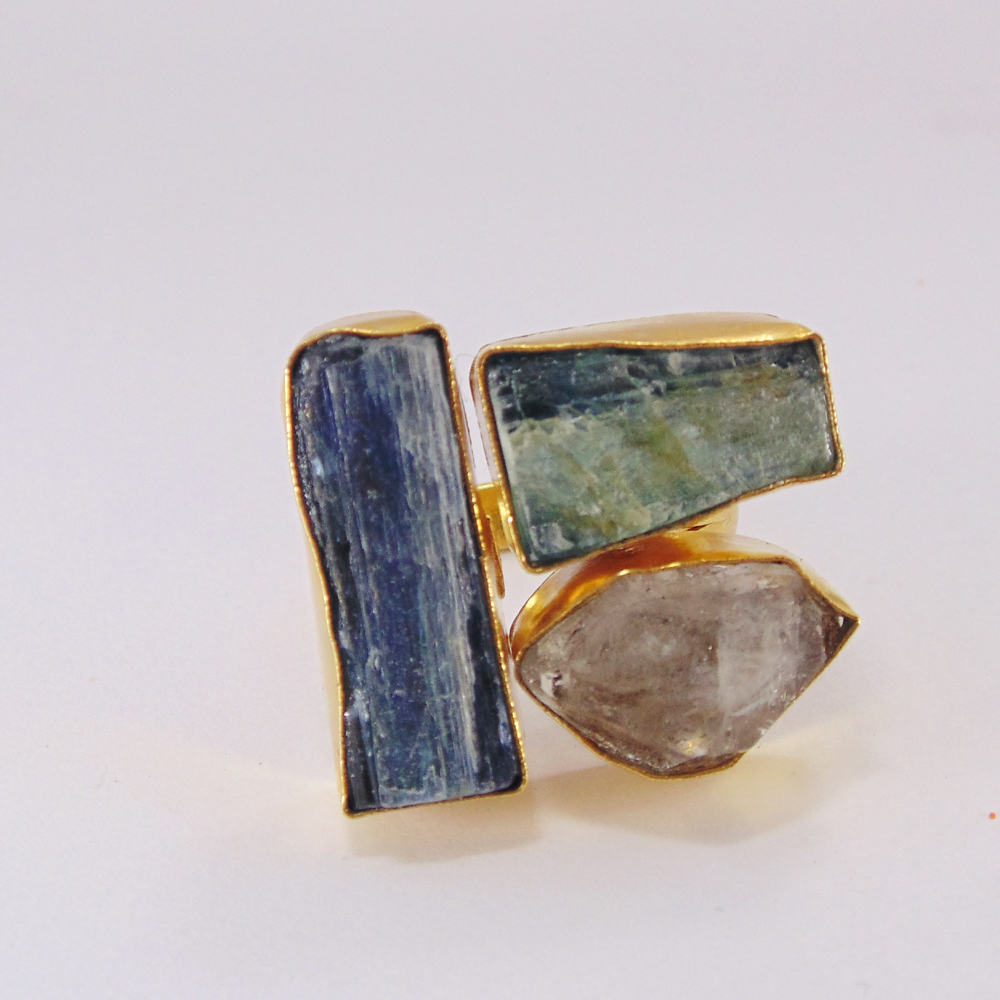 Herkimer Diamond Ring - Handmade Brass Ring - Blue Kyanite Ring - Adjustable Ring - Designer Ring - Large Cocktail Ring - Gift For Her