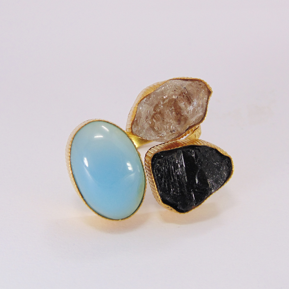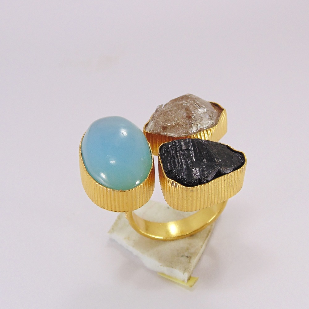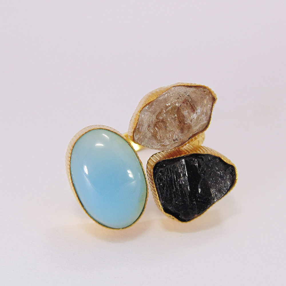 Aqua Chalcedony Ring - Gold Plated Ring - Herkimer Diamond Ring - Bezel Set Ring - Three Stone Ring - Tourmaline Ring - Adjustable Ring
