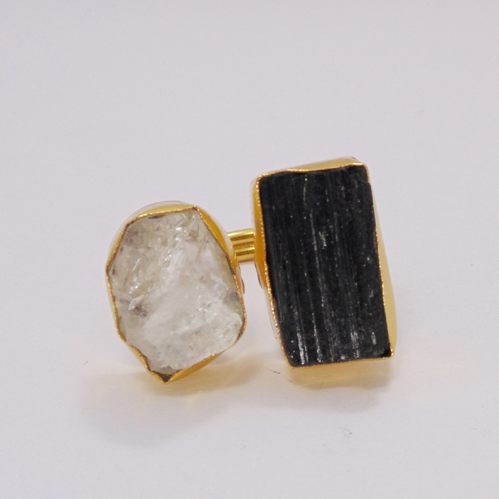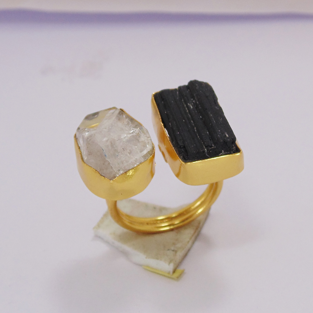 Herkimer Diamond Rings - Gold Plated Fashion Ring - Genuine Gemstone Ring - Black Tourmaline Stone Ring - Healing Stone Ring Jewelry- Adjustable Jewelry Ring - Statement Rings