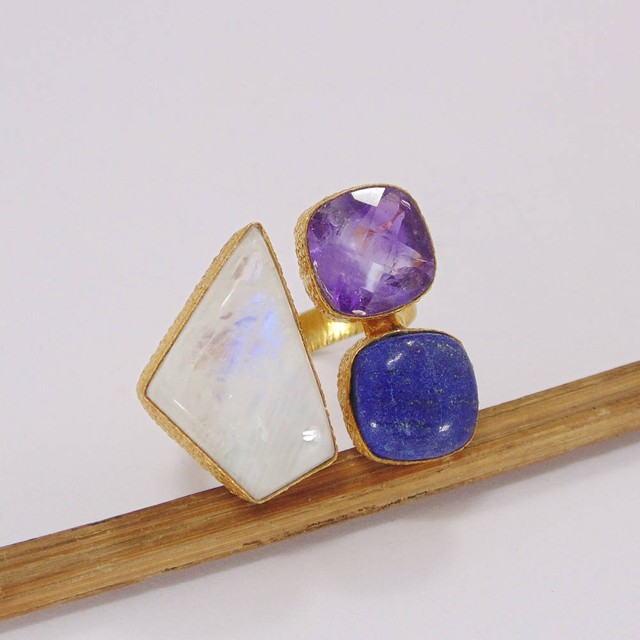 Product DetailsItem Code: AGRBR-996-IGross Wt. 9.00 GmsStone Name: Rose Quartz,Aquamarine, AmethystMetal: 18K Yellow Gold Plated Over BrassRing Size: 6, 7