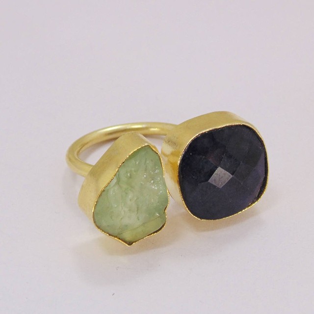 Natural Black Spinel Aquamarine Raw Stone Adjustable Gold Vermeil Ring