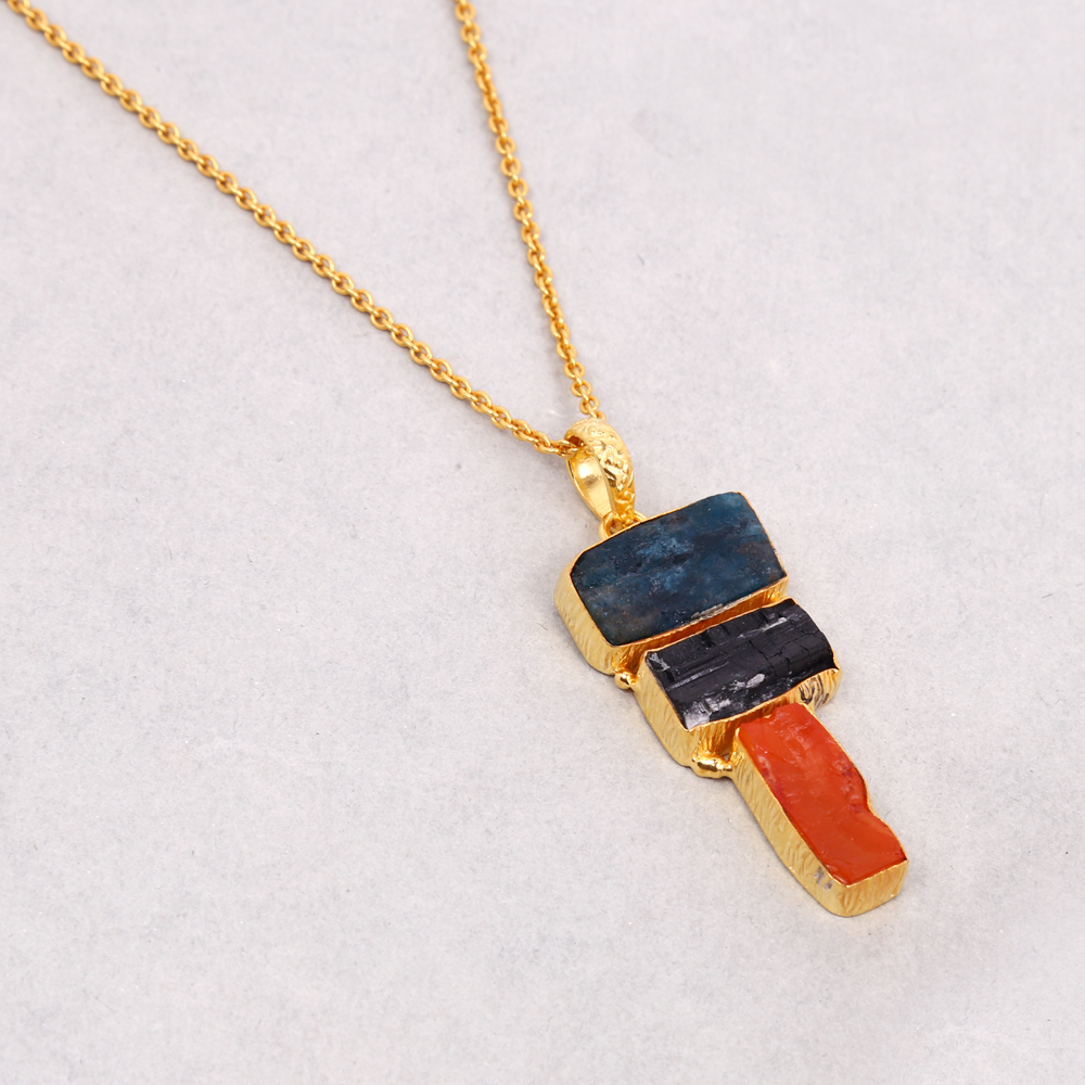 Artisan Made Pendant, Carnelian Pendant, Three Stone Pendant, Bezel Set Stone Pendant, Apatite Stone Pendant, 18K Gold Plated Necklace, Fashion Pendant