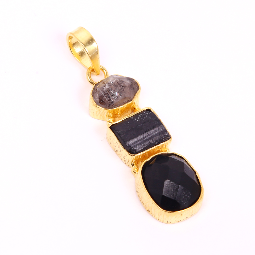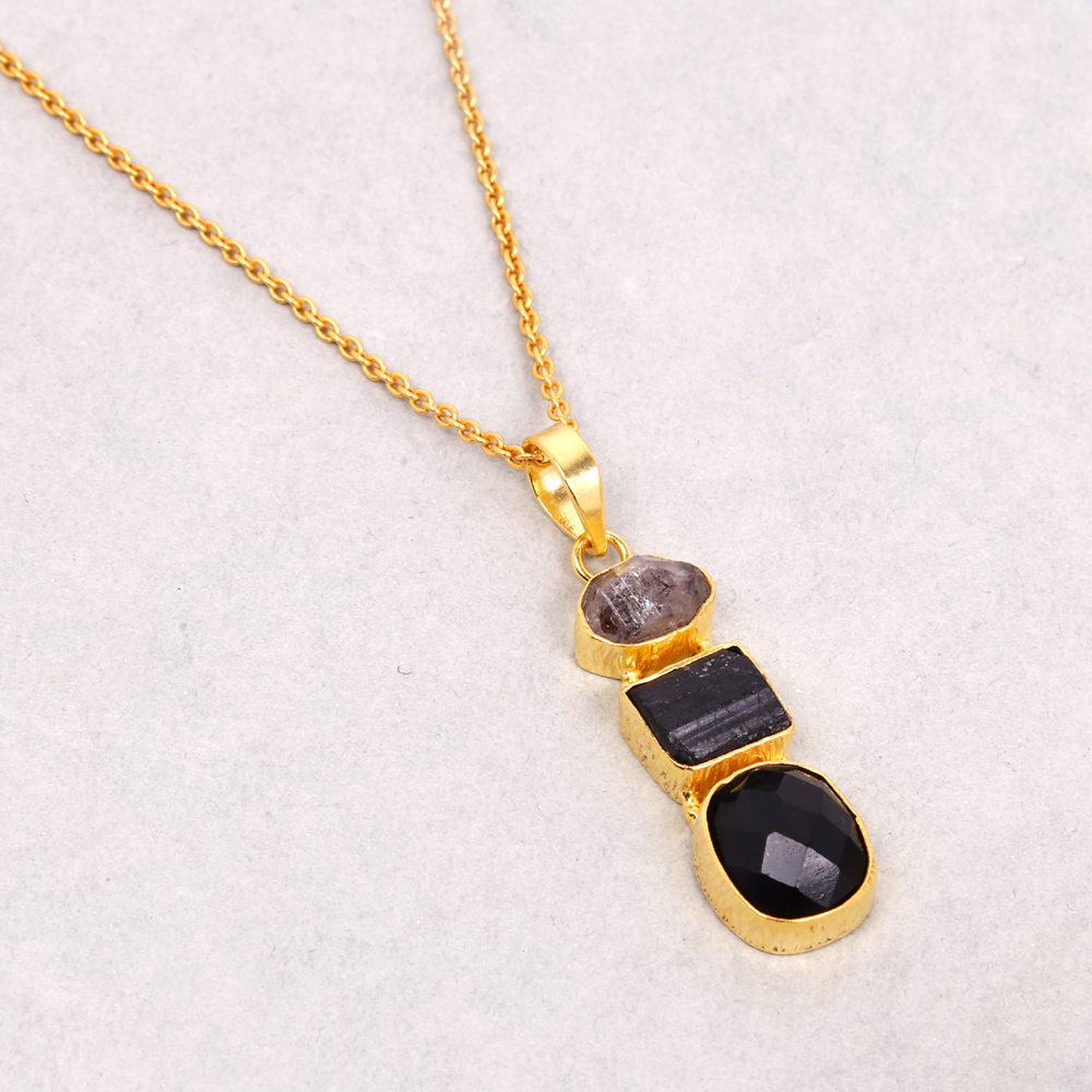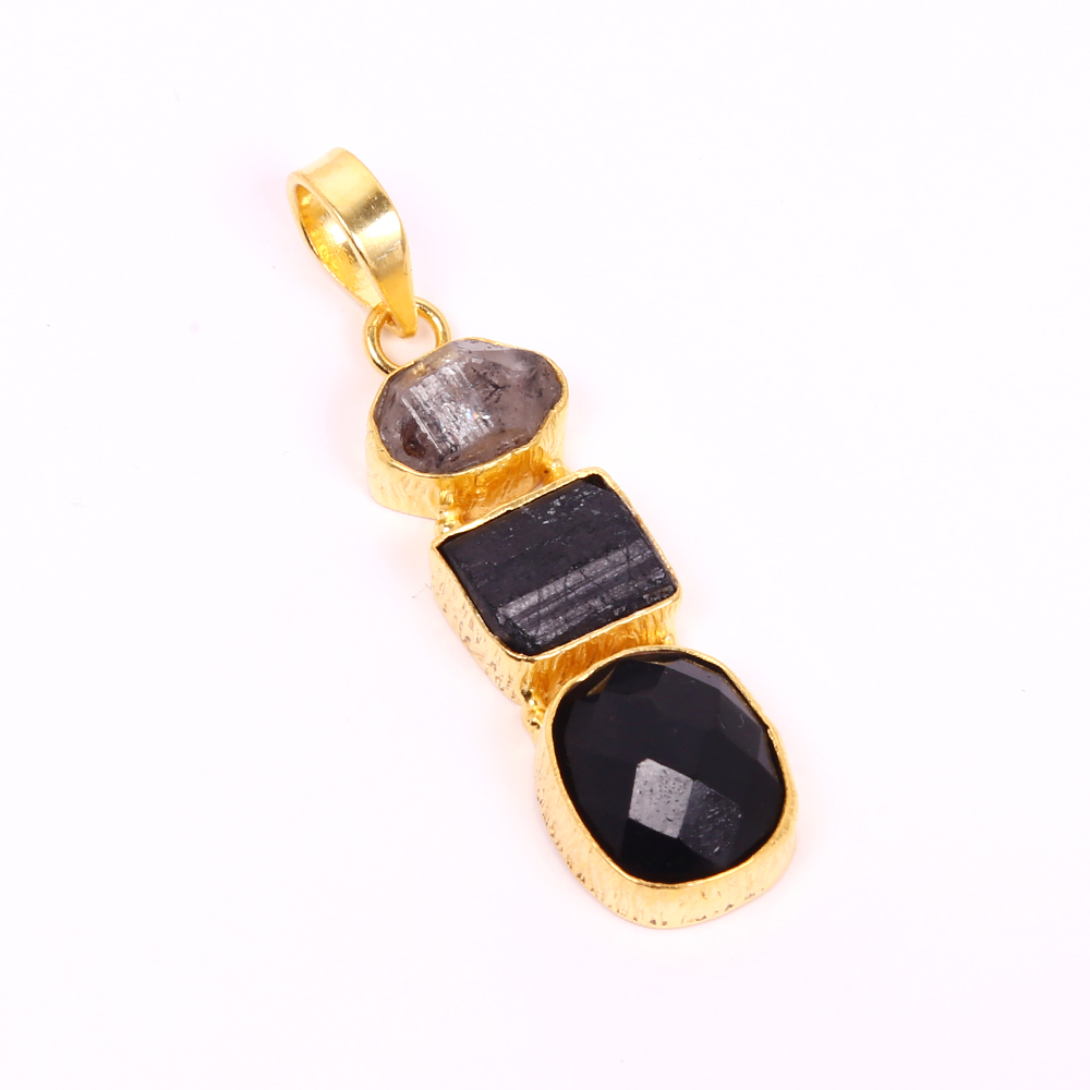 Black Onyx and Herkimer Diamond Gold Plated Brass Pendant Jewelry