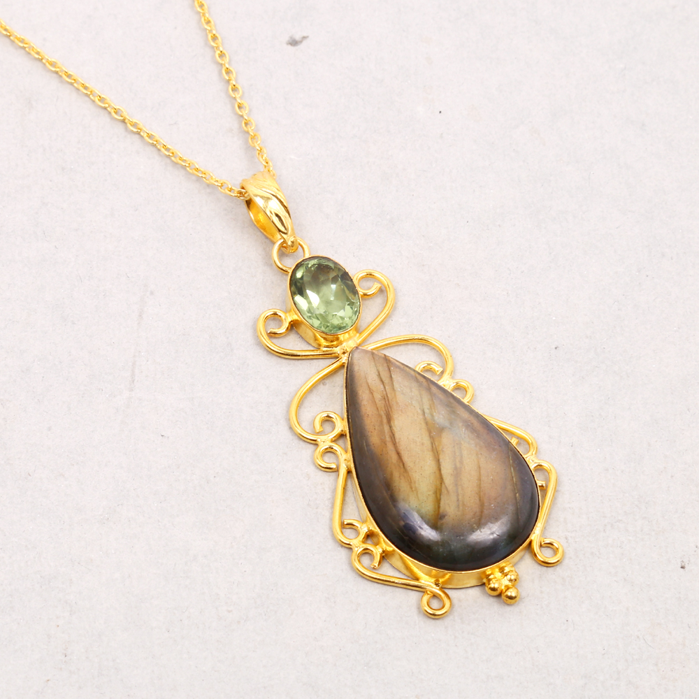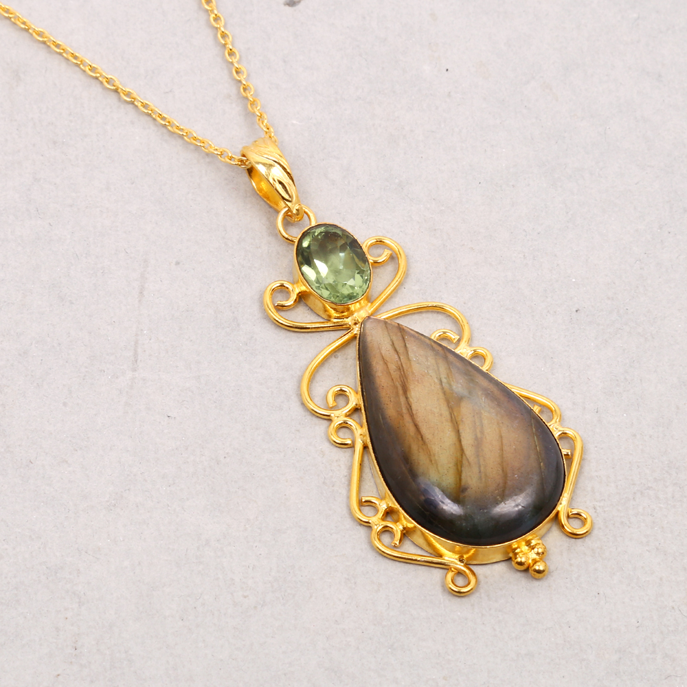 Labradorite and Green Amethyst Large Gemstone Pendant With Chain