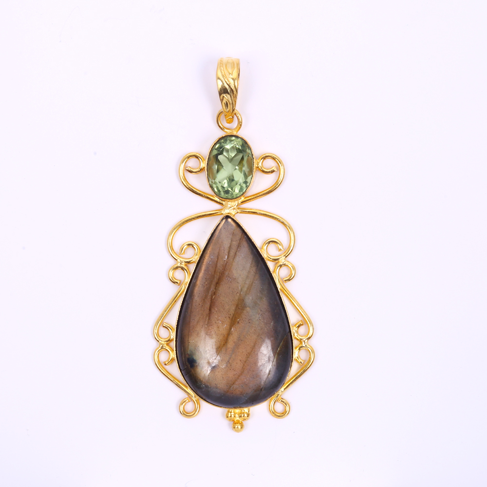 Framed in 22-karat yellow gold vermeil brass, this unique artisan hand-crafted blue fire labradorite and created green amethyst gemstone pendant exudes an enchanting aura creating a perfect designer pendant for your neck. Designer Labradorite Pendant, 22K Gold Vermeil Pendant, Large Pendant, Green Amethyst Pendant, Cocktail Party Pendant, 18" Chain Necklace Product Details Item Code: IAJB9-1050 Gross Wt. 23.50 Gms Stone Name: Labradorite / Green Amethyst Stone Shape : Pear/Oval Stone Size : 30*45mm / 15*20mm Metal: 18K Yellow Gold Plated Over Brass Pendant Size: 7.50 X 3.70 Cms