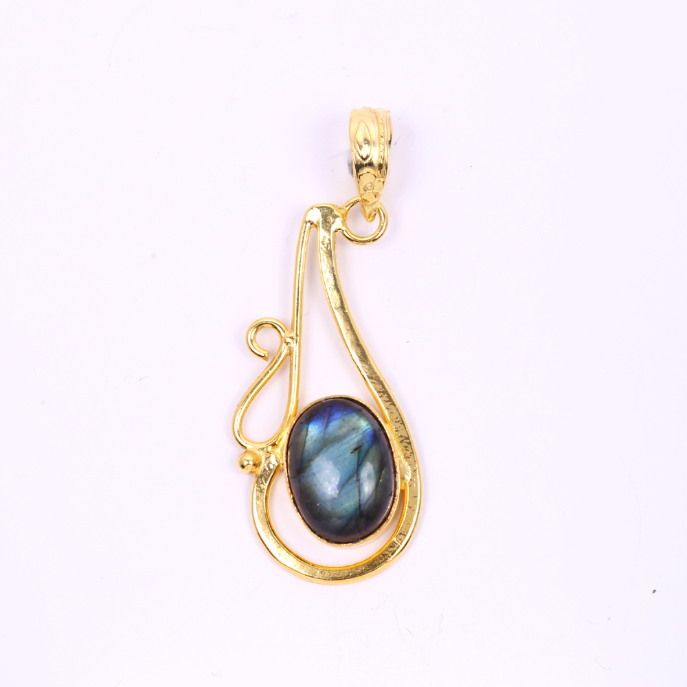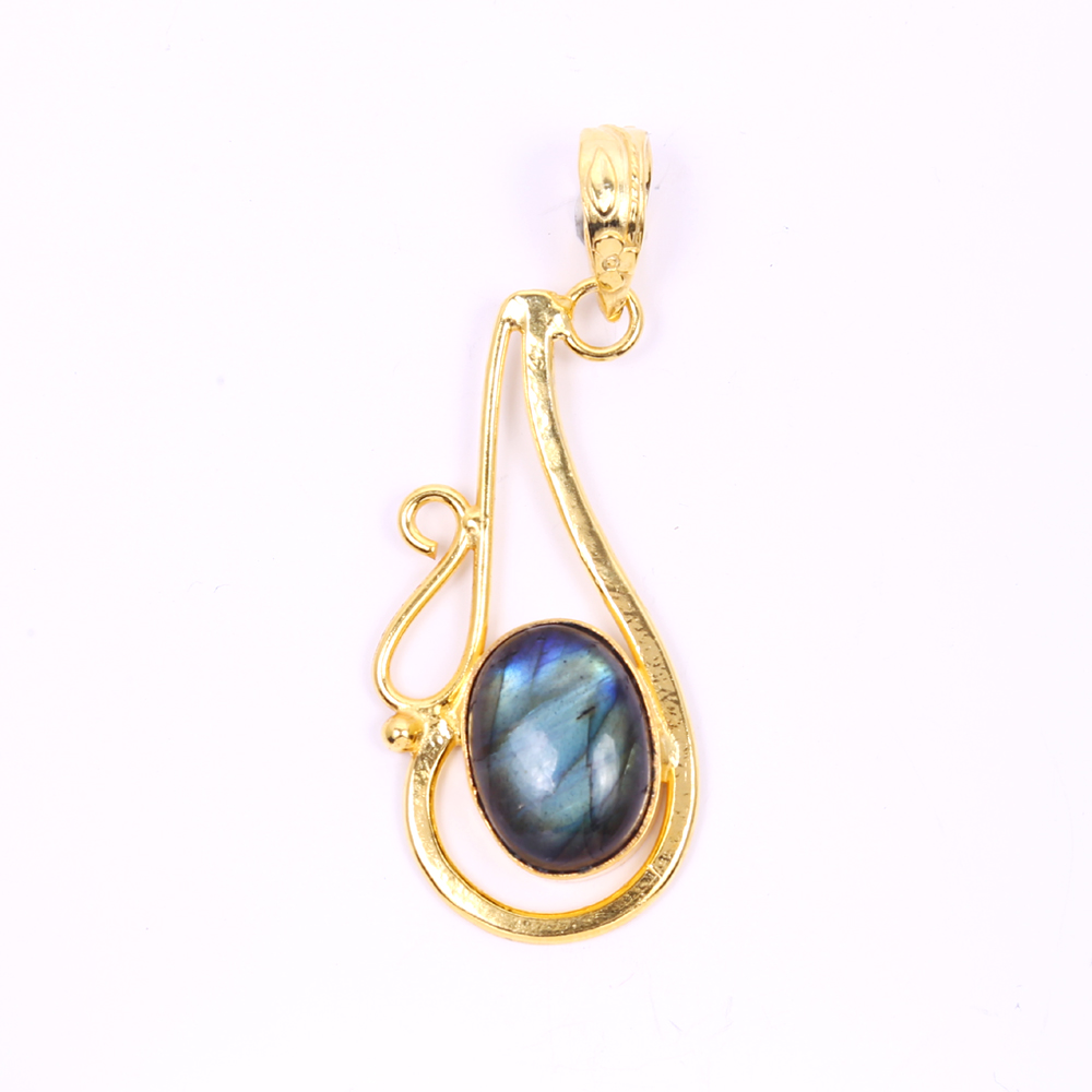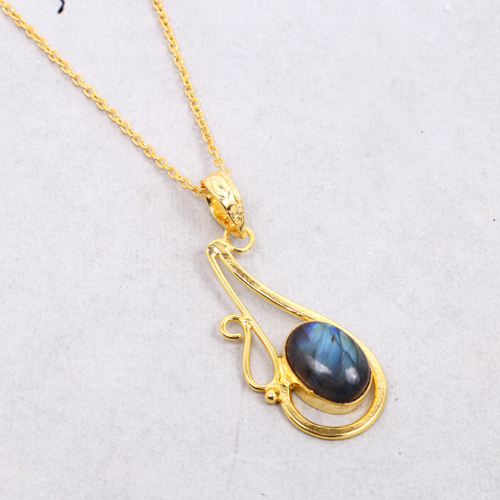 This is stylish and trendy 18-karat yellow gold plated fashion pendant With a oval-shaped labradorite gemstone at bottom, this bold and beautiful brass pendant is the perfect finishing touch for a variety of looks.