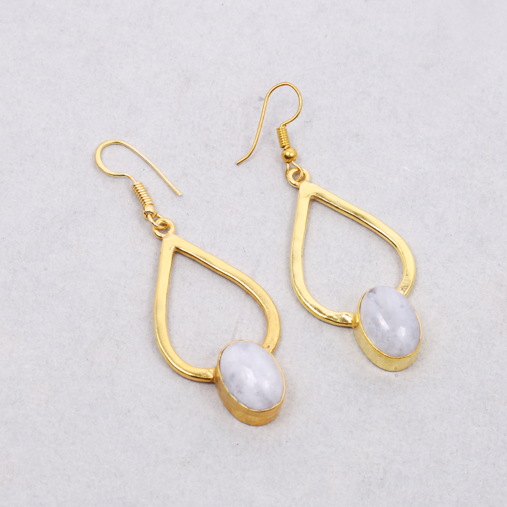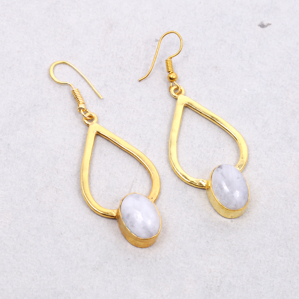 Beauifully Hand-Crafted Rainbow Moonstone Gold Plated Dangle Hook Earrings