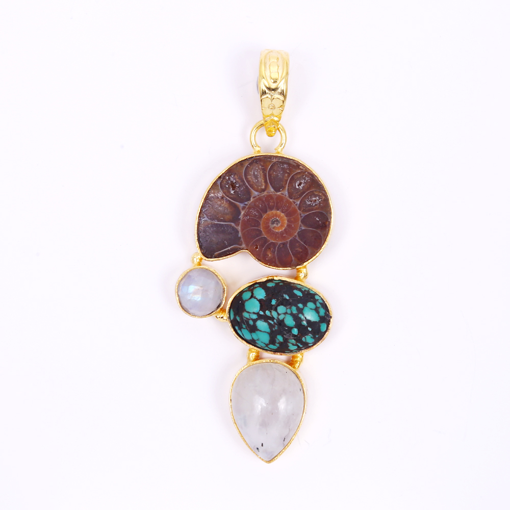 Beautifully hand-crafted by skilled artisan 18K yellow gold plated designer pendant with a bezel-set, pear-shaped rainbow moonstone, turquoise and ammonite gemstone. Let the natural glamour of this ancient stone help brighten your everyday look. Product Details Item Code: IAJB9-1055 Gross Wt. 14.00 Gms Stone Name: Rainbow Moonstone, Turquoise And Ammonite Metal: 18K Yellow Gold Plated Over Brass Pendant Size: 5.70 X 2.60 Cms