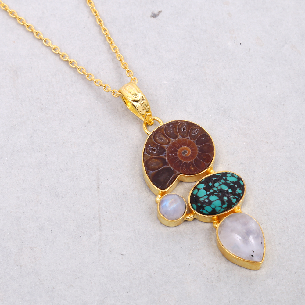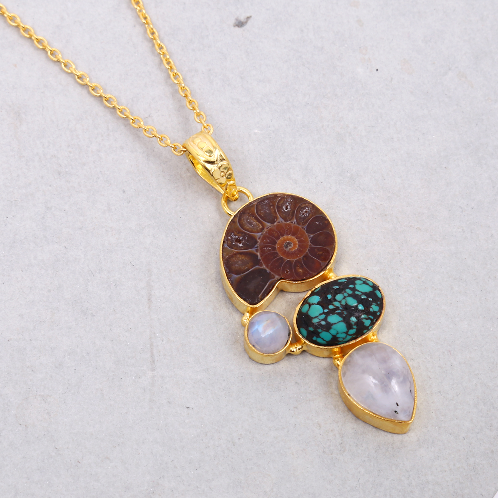 Bezel Set Fossil Ammonite, Turquoise And Rainbow Moonstone Pendant with Chain