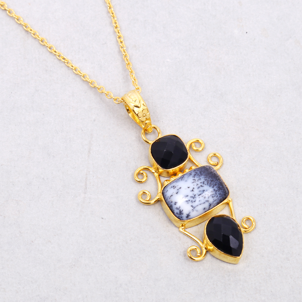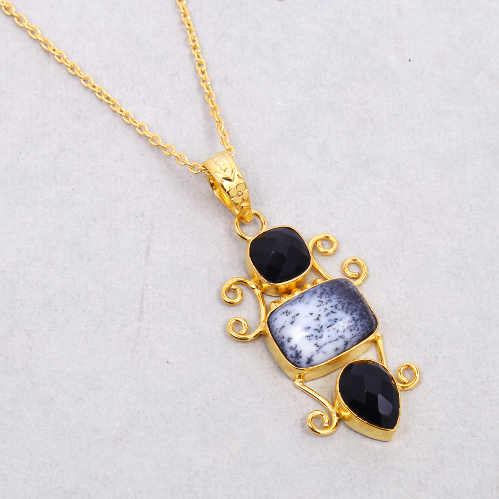 Faceted Black Onyx And Dendritic Agate Gold Vermeil Gemstone Pendant With Chain
