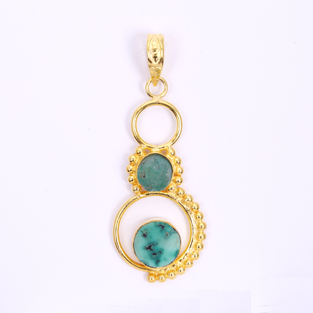 This highly finish, 18k yellow gold plated beautiful statement pendant is a true stunner, crafted with a combination of bezel-set natural tibetan turquoise and green druzy quartz. Handcrafted Pendant, Green Druzy Pendant, Brass Pendant, Beautiful Pendant, Turquoise Pendant, Designer Pendant, Bridesmaid Gift Necklace Product Details Item Code: IAJB9-1059 Gross Wt. 11.20 Gms Stone Name: Green Druzy Quartz Metal: 18K Yellow Gold Plated Over Brass Earrings dimension: 5.70 X 2.60 Cms