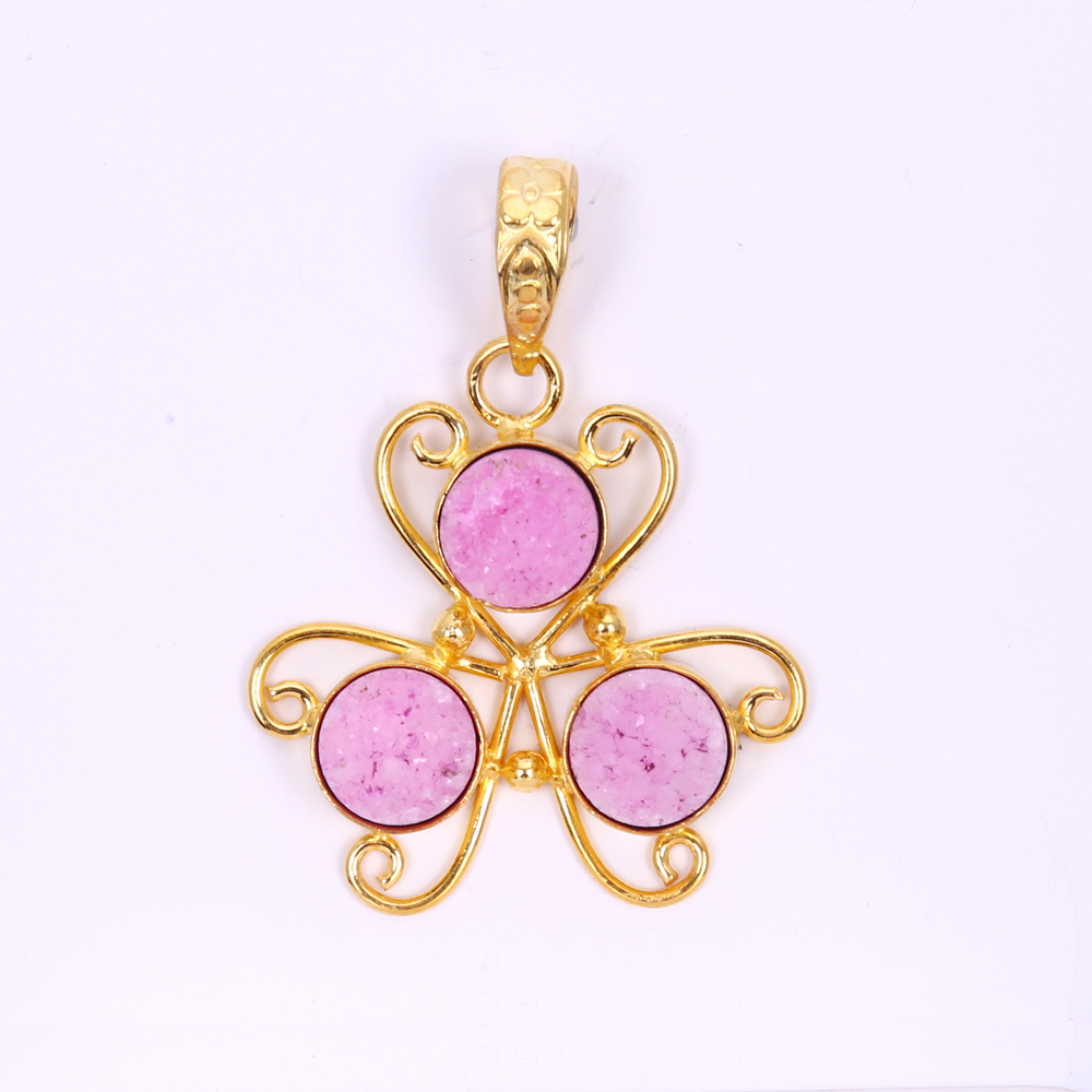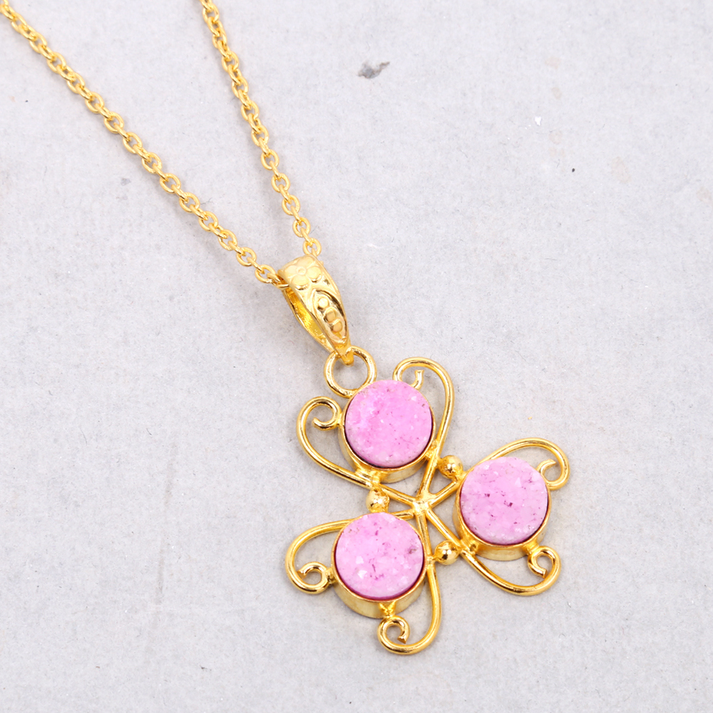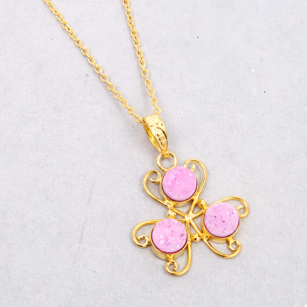 18K Gold Plated Pink Druzy Brass Bezel Set Designer Pendant With Chain