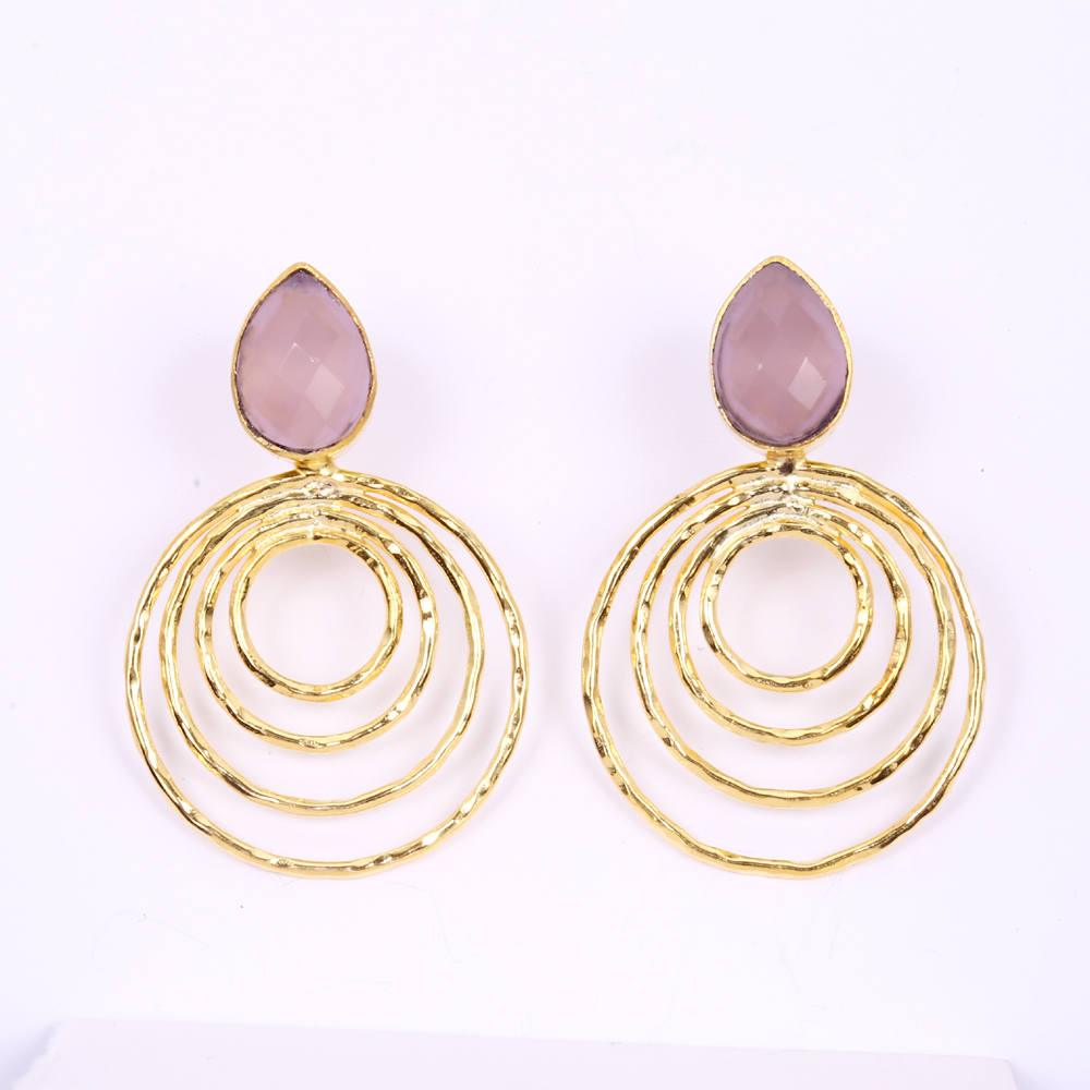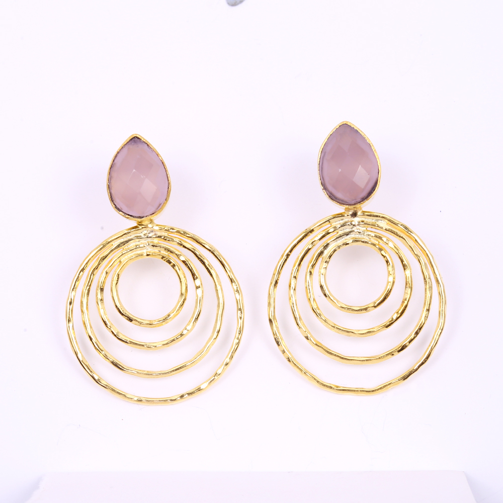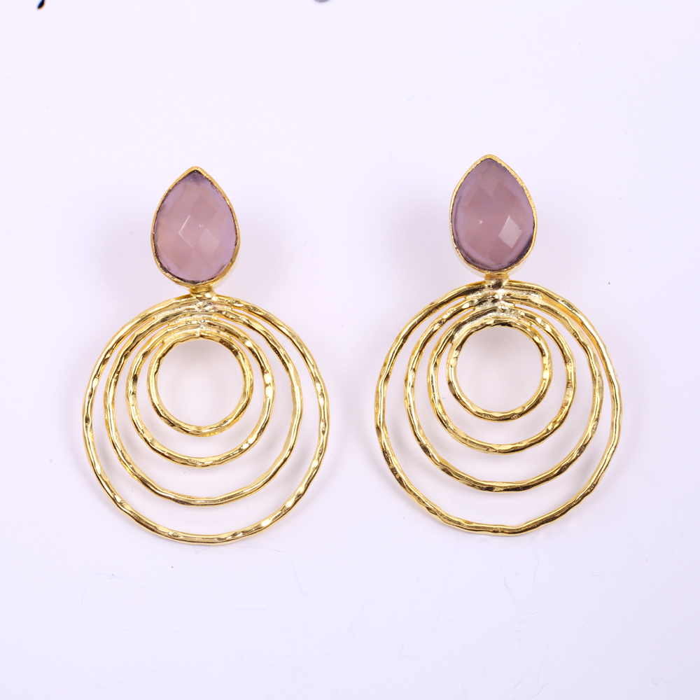 Keep it elegant with this stunning 18-k yellow gold plated brass hammered circle dangle earrings. The rose quartz adds a softness to the look perfect for the hands on bridesmaid.