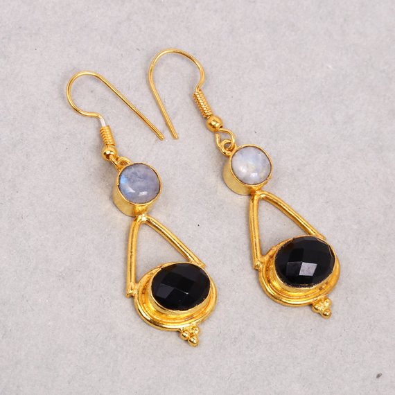 Black Onyx and Rainbow Moonstone Brass Gold Plated Dangle Earrings Gift For Wife