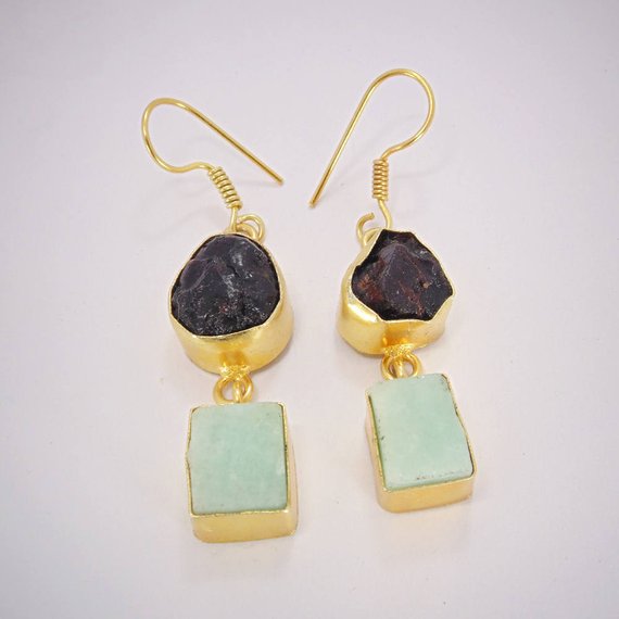 Raw Garnet And Aquamarine Gemstone Bezel Set Dangle Brass Earrings For Women