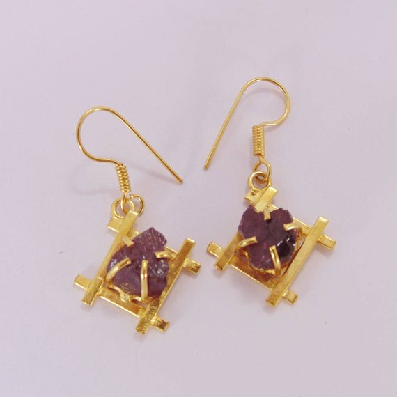 Designer Handmade Raw Garnet Gold Vermeil Brass Dangle Earrings