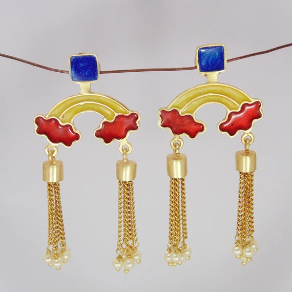 Handmade Earring, Red Enamel Earrings, Gold Plated Earrings, Designer Earrings, Chain Chandelier Earrings, Bridal Earrings, Weddings Jewelry