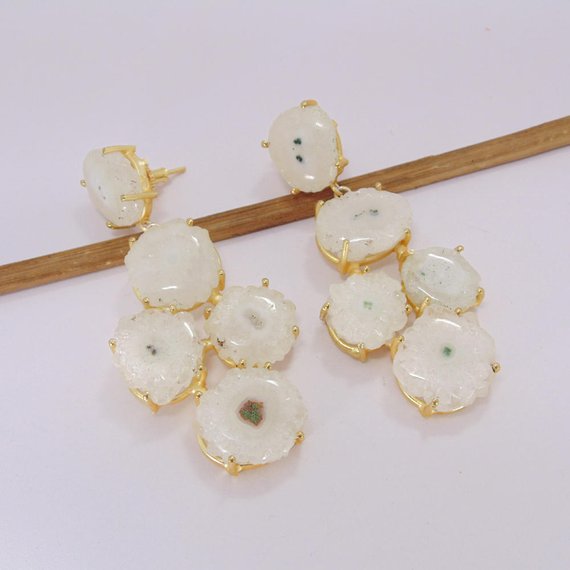 Designer Solor Quartz Prong Set Large Dangle Long Gold Earrings