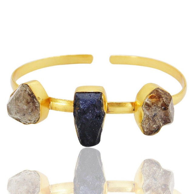 Herkimer Diamond Bangle - Gold Plated Cuff Bangle - Black Tourmaline Bangle - Brass Bangle Bracelet - Handmade Bangle - Womens Bangle