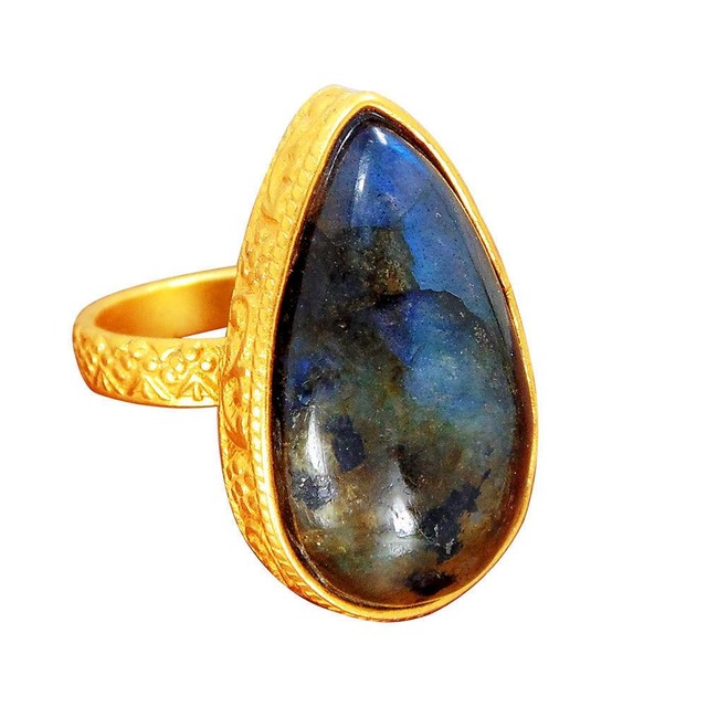 A pear shaped statement ring handmade out of natural labradorite cabochon gemstone and plated in 18K yellow gold is a wonderful Christmas gift for women.
