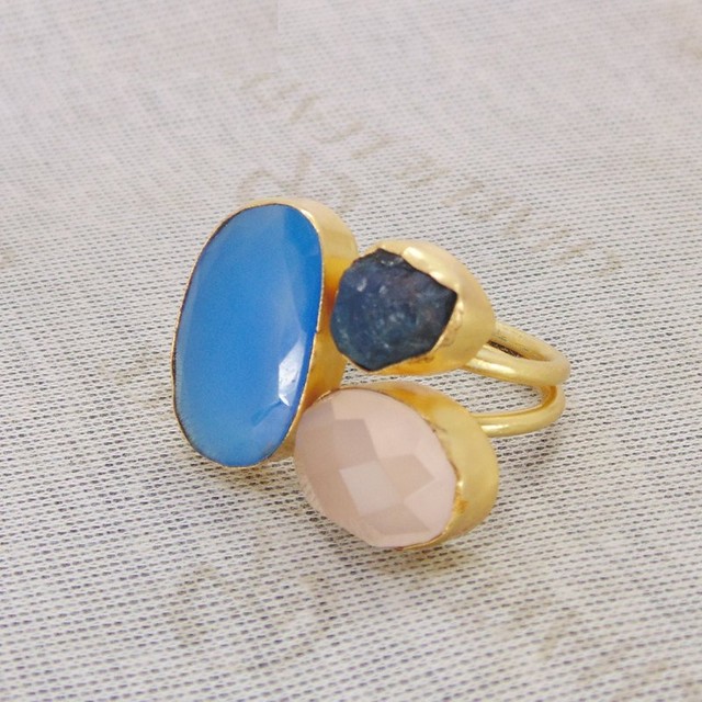 Delightful hues of faceted blue chalcedony, rose quartz and raw apatite make this three stone cocktail ring cast in 18k gold plating a true handmade designer jewellery sensation for its wearer.