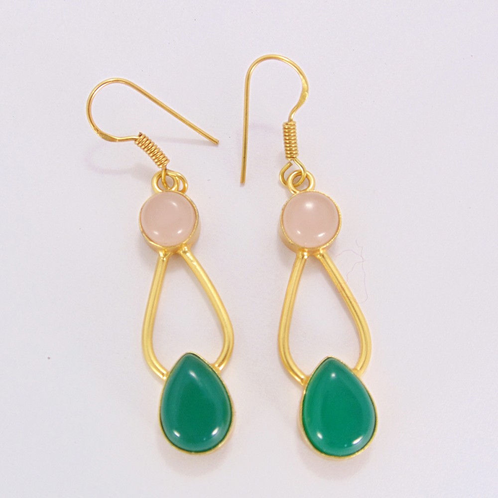 Designer Green Onyx And Rose Quartz Double Stone Earrings
