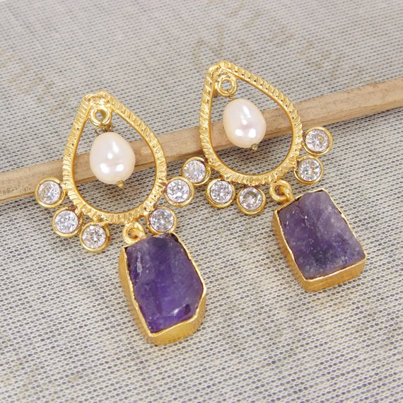 Natraul Amethyst Earrings - Pearl Earrings - Handmade Earrings - Gold Vermeil Earrings - Rough Stone Earrings - Dangle Earrings - Womens Gift Jewelry