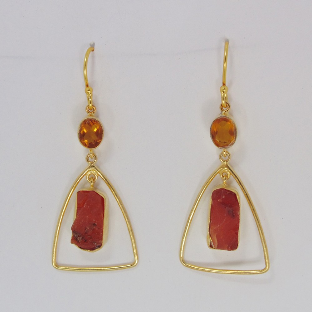 Designer Handmade Carnelian And Citrine Rough Birthstone Gold Plated Dangle Earrings