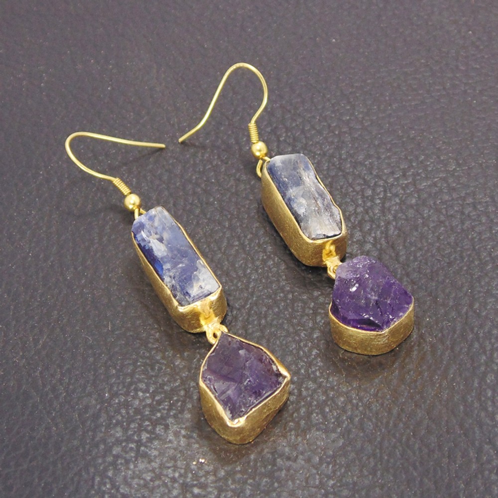 22k Gold Plated Earrings - Raw Amethyst Earrings - Birthstone Earrings - Handmade Earrings - Blue Kyanite Earrings - Stone Earring - Wire Hook Earrings