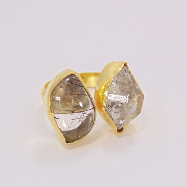 Herkimer Diamond Black Rutile Shiny Gold Adjustable Party Wear Ring