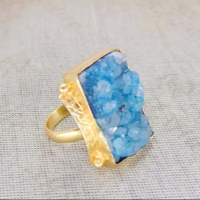 Natural Rough Bezel Set Blue Druzy Gemstone Statement Ring