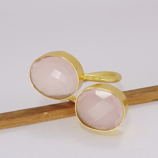 Handmade Modern 22k Gold Plated Rose Quartz Gemstone Bypass Ring