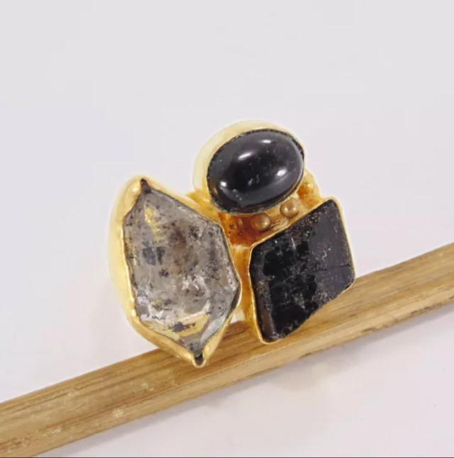 Product DetailsItem Code: BR-0142Gross Wt. 8.00 GmsStone Name: Herkimer Diamond, Black Onyx, TourmalineMetal: Yellow Gold Plated Over BrassRing Sizes: Please choose from drop down menu. If you do not see your finger size, select custom and I'll make a ring just for you!