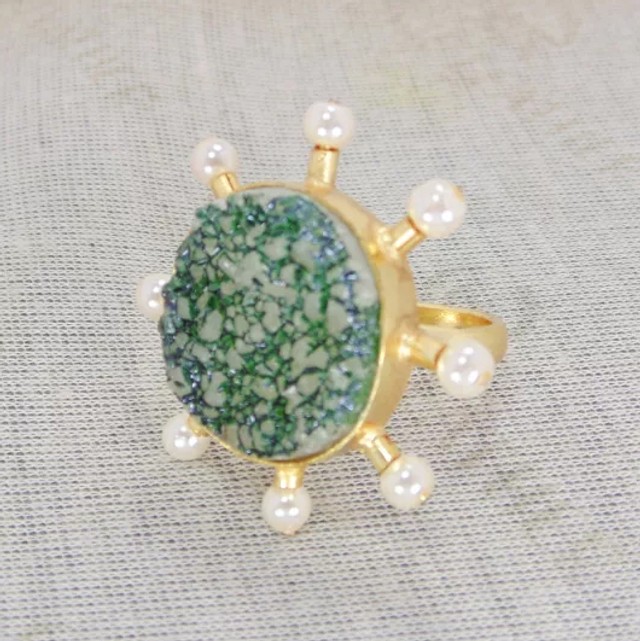 Beautiful Pearl And Round Druzy Stone Cocktail Ring