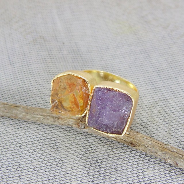 Purple Amethyst Raw Citrine Adjustable Dual, Rough and Birthstone Ring