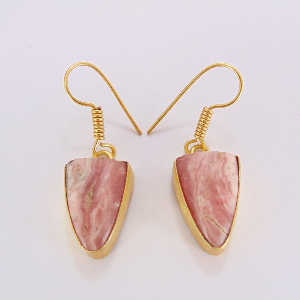 Handmade Rhodochrosite Gemstone Triangle Brass Drop Earrings For Women