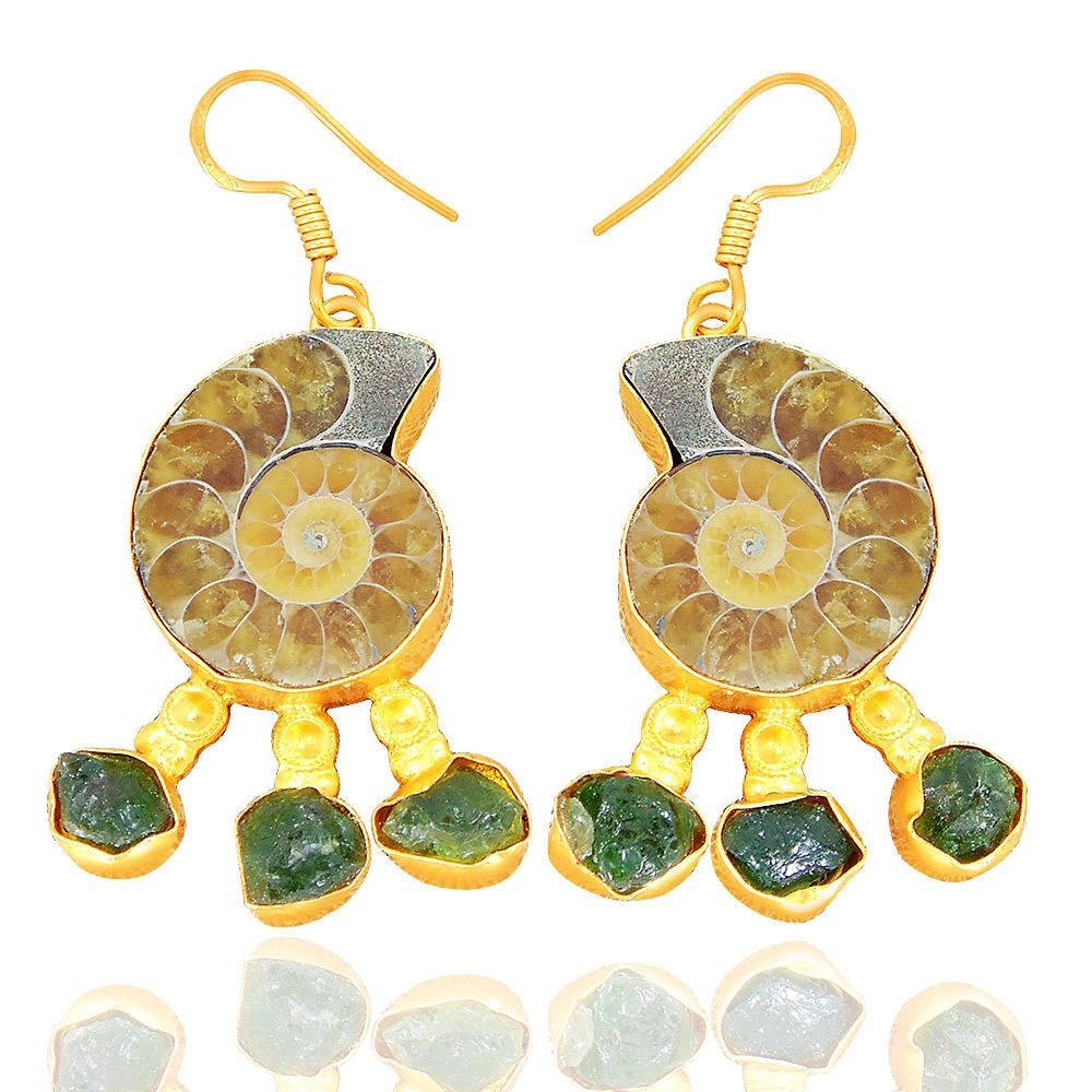 Handmade Ammonite Bezel Set Raw Peridot Fossil Dangle Earrings For Women