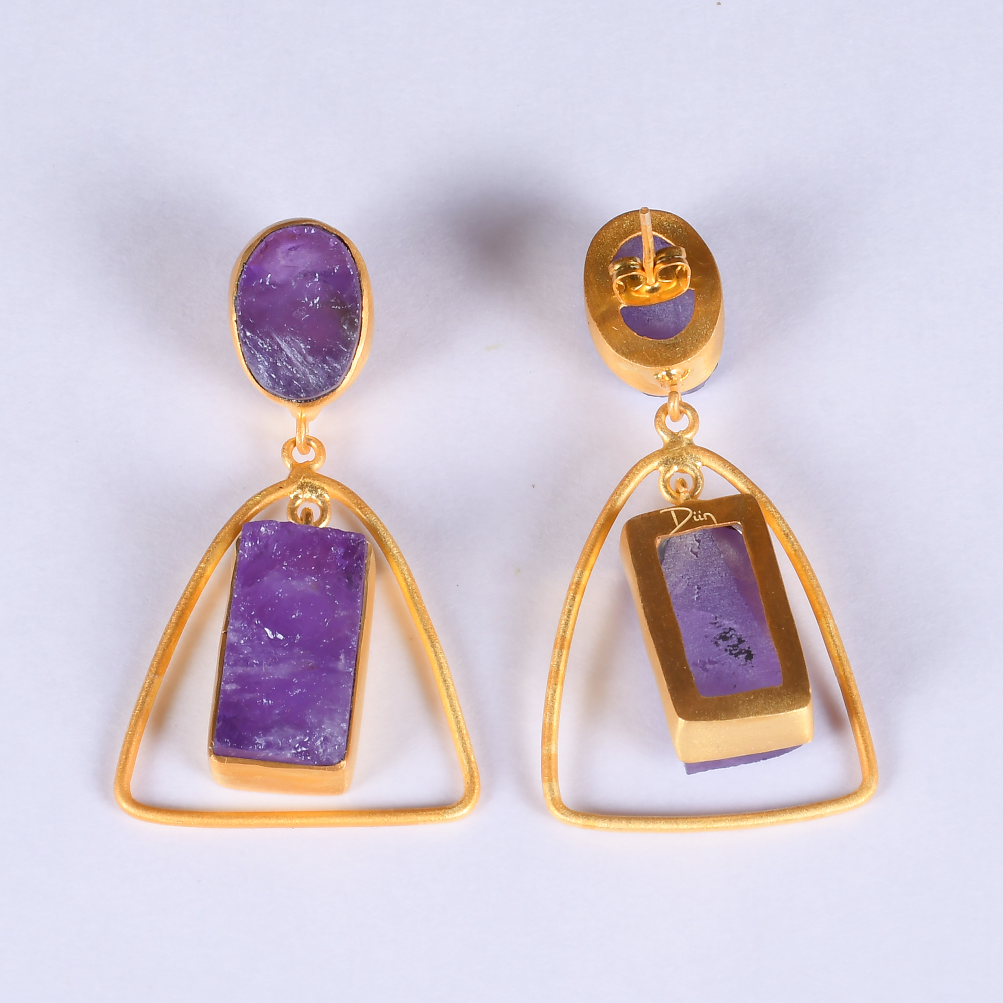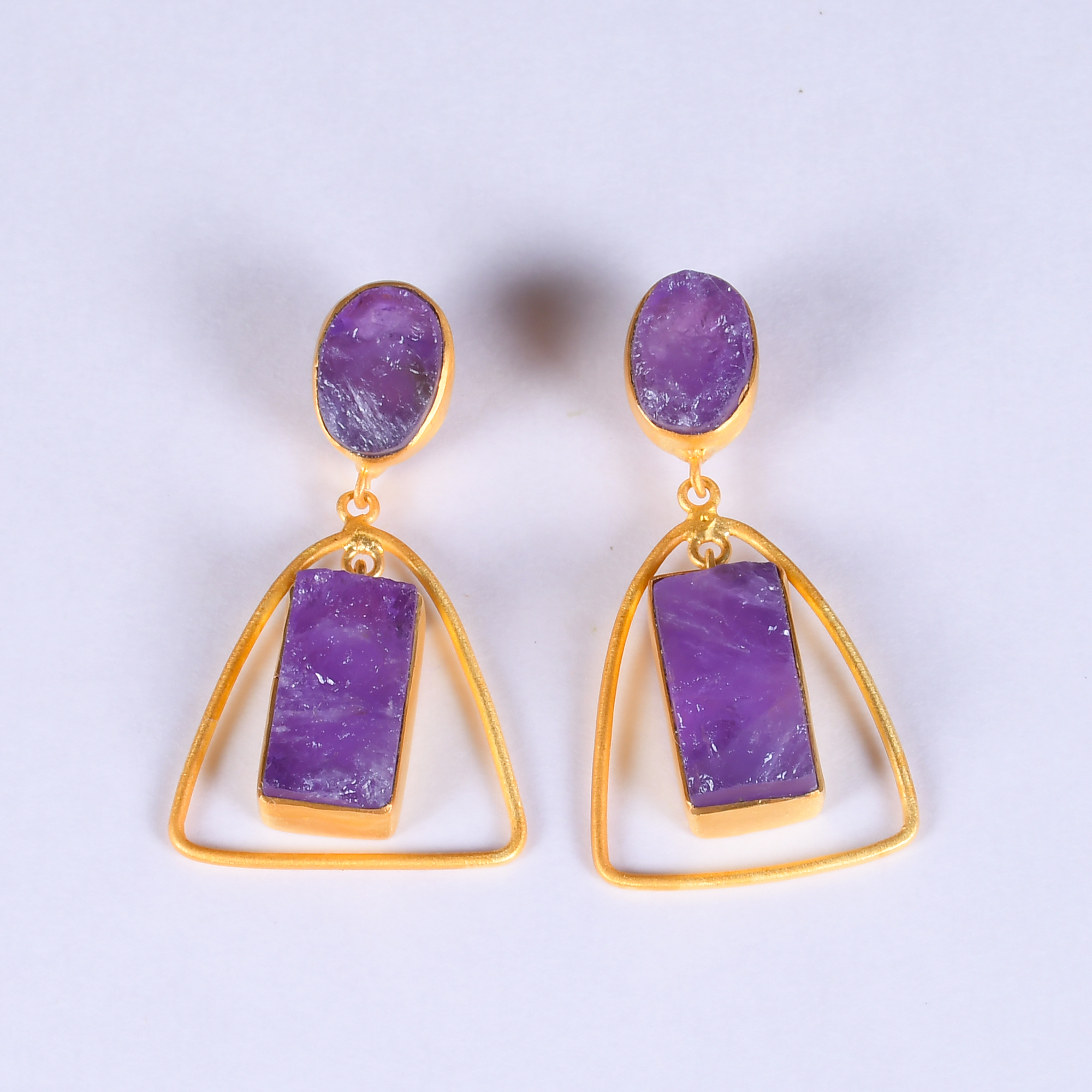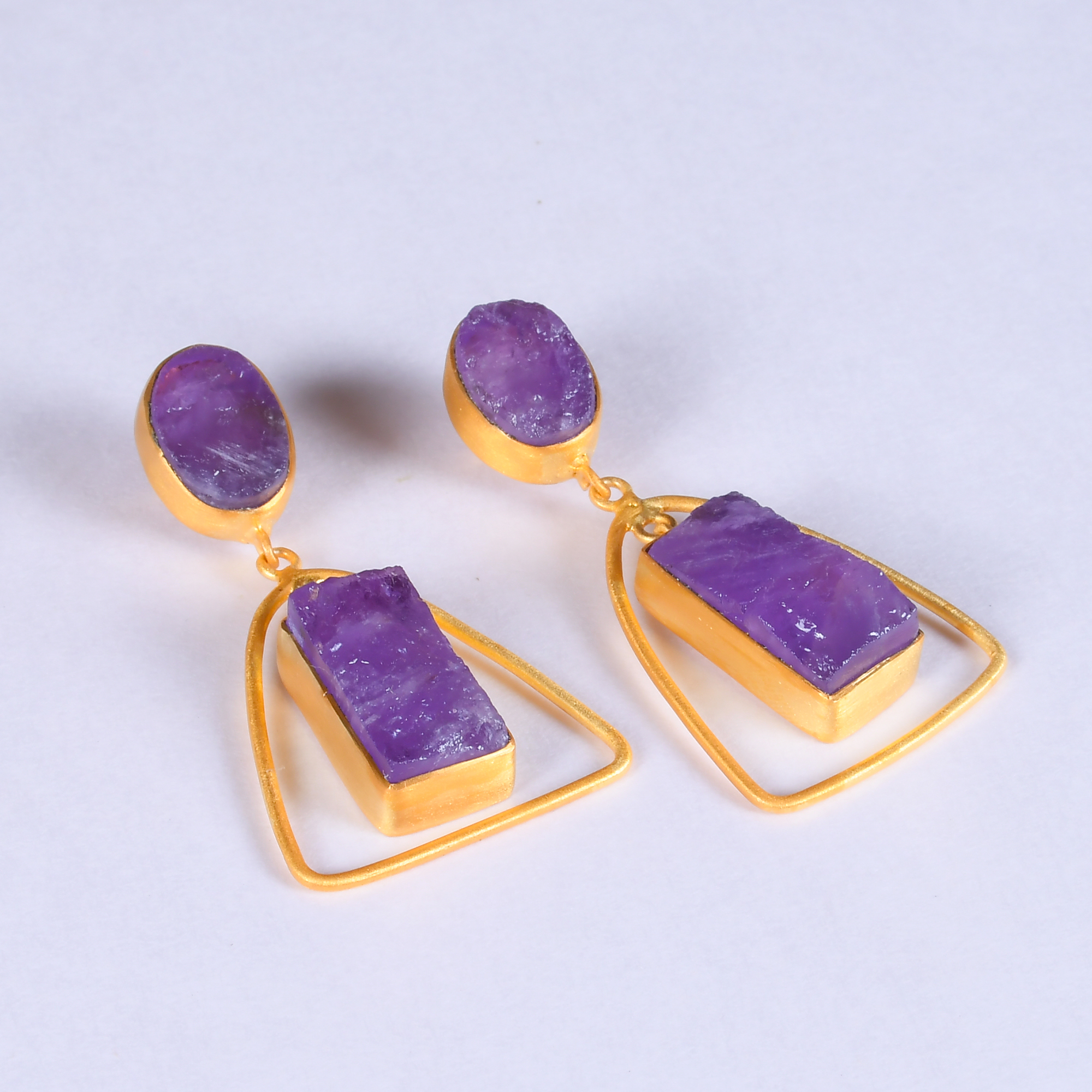18K matte gold-plated raw amethyst dangle earrings are nothing short of a romance. Trendy matte gold-plated earrings accentuate the purple gemstone, making quite a statement. Each gemstone piece handpicked by Bhagat Jewels is carefully handcrafted and reflects Indian heritage.