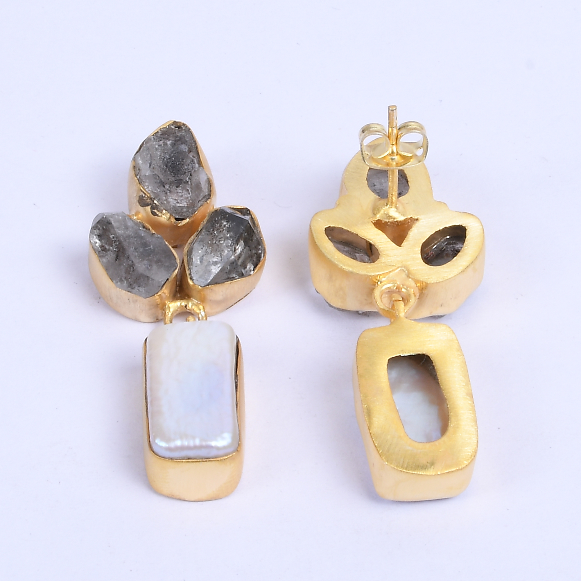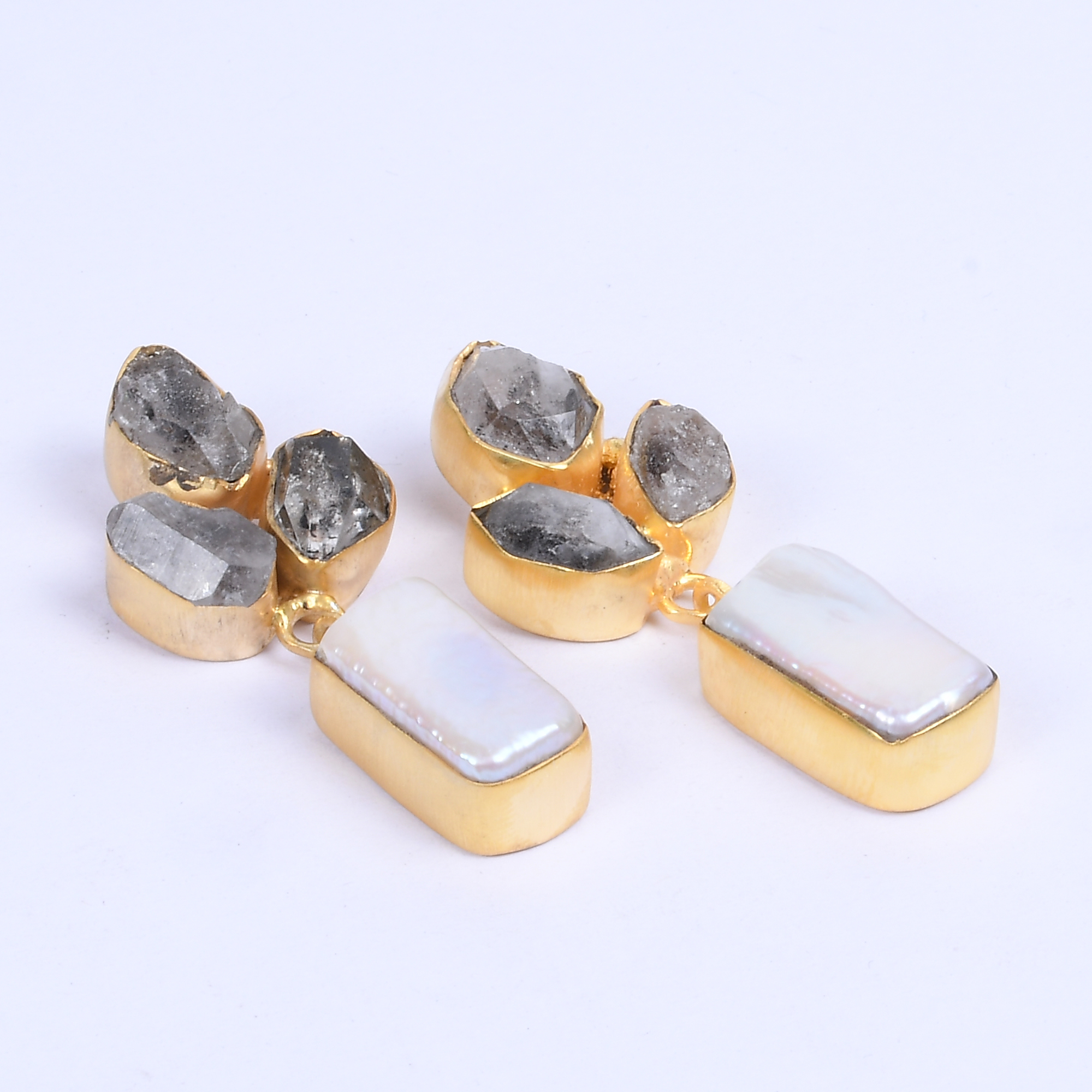 Natural Stone Earrings, Herkimer Diamond Earrings, Gold Plated Earrings, Bezel Set Earrings, Pearl Earrings, Dangle Earrings, Women Earrings