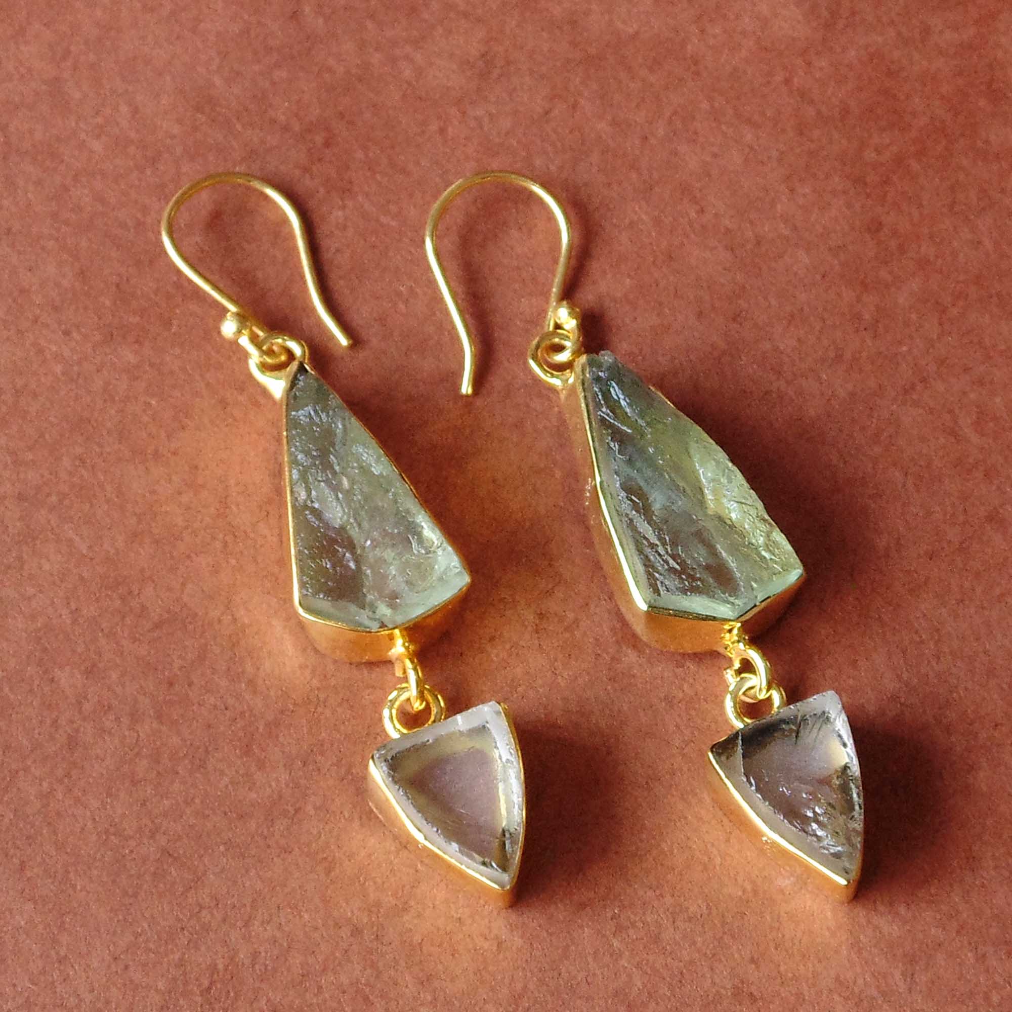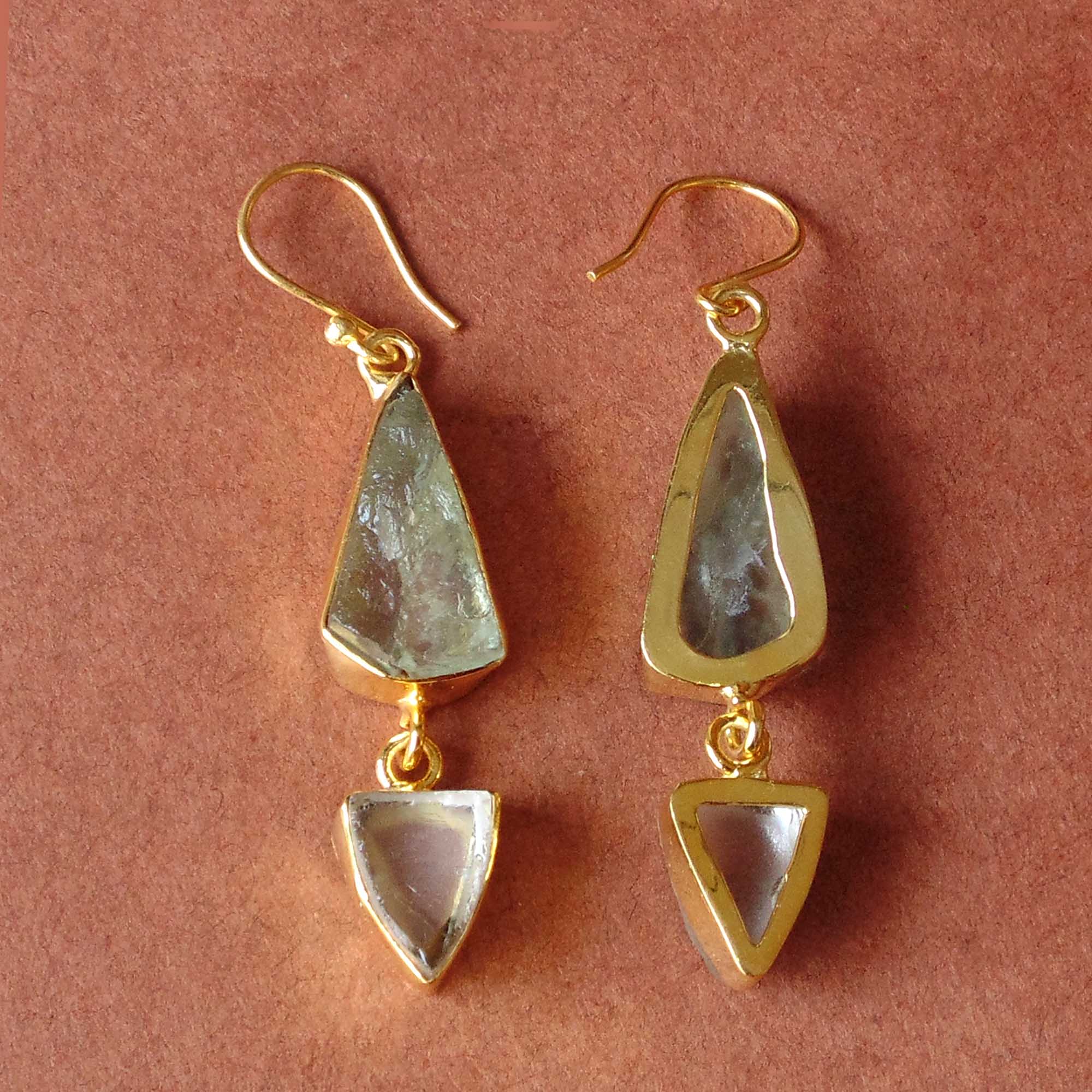 The pairing of natural green Fluorite with raw clear quartz crystal never fails to impress. This brass stone dangle design is also ideal birthstone earring and 18k yellow gold plating adds a subtle luster.