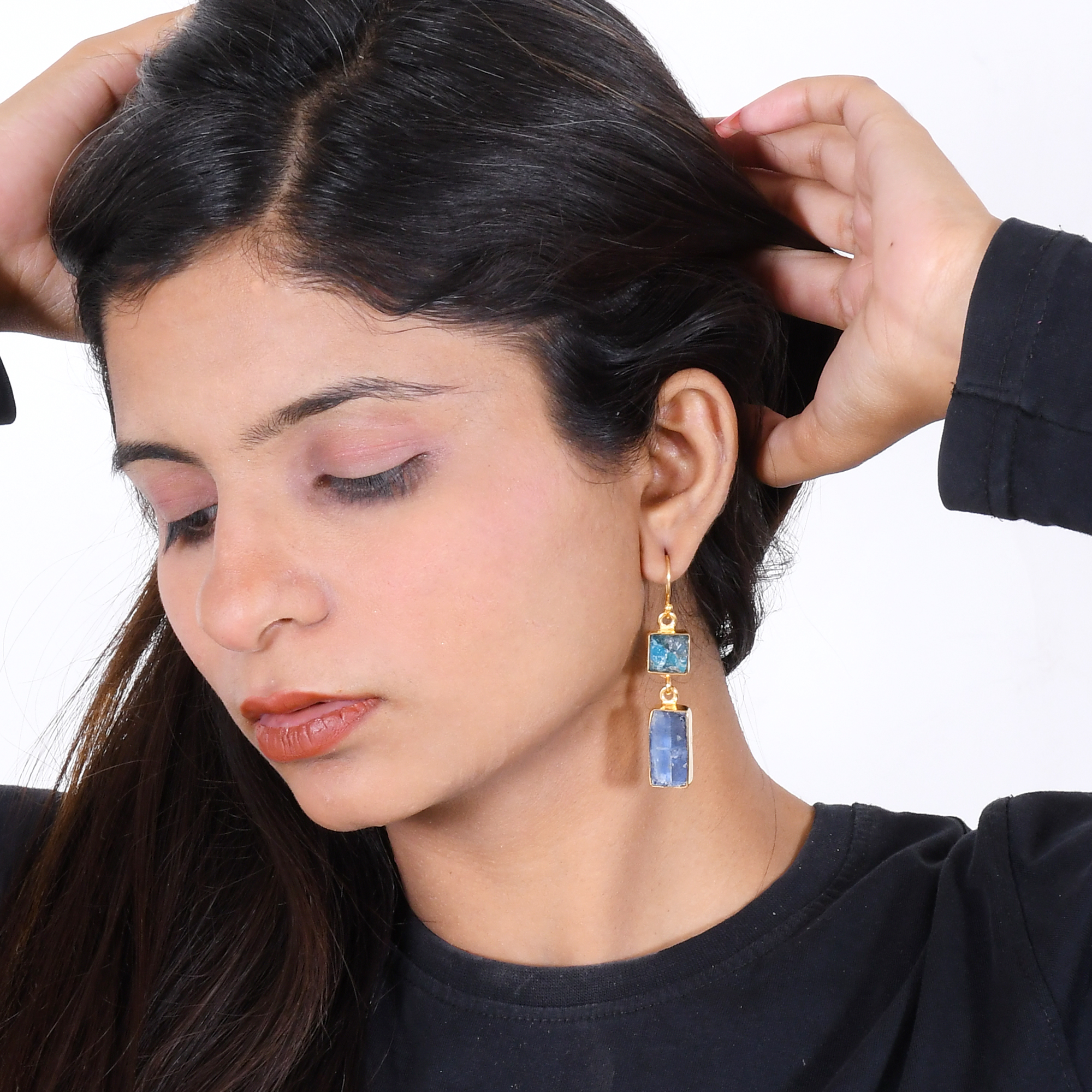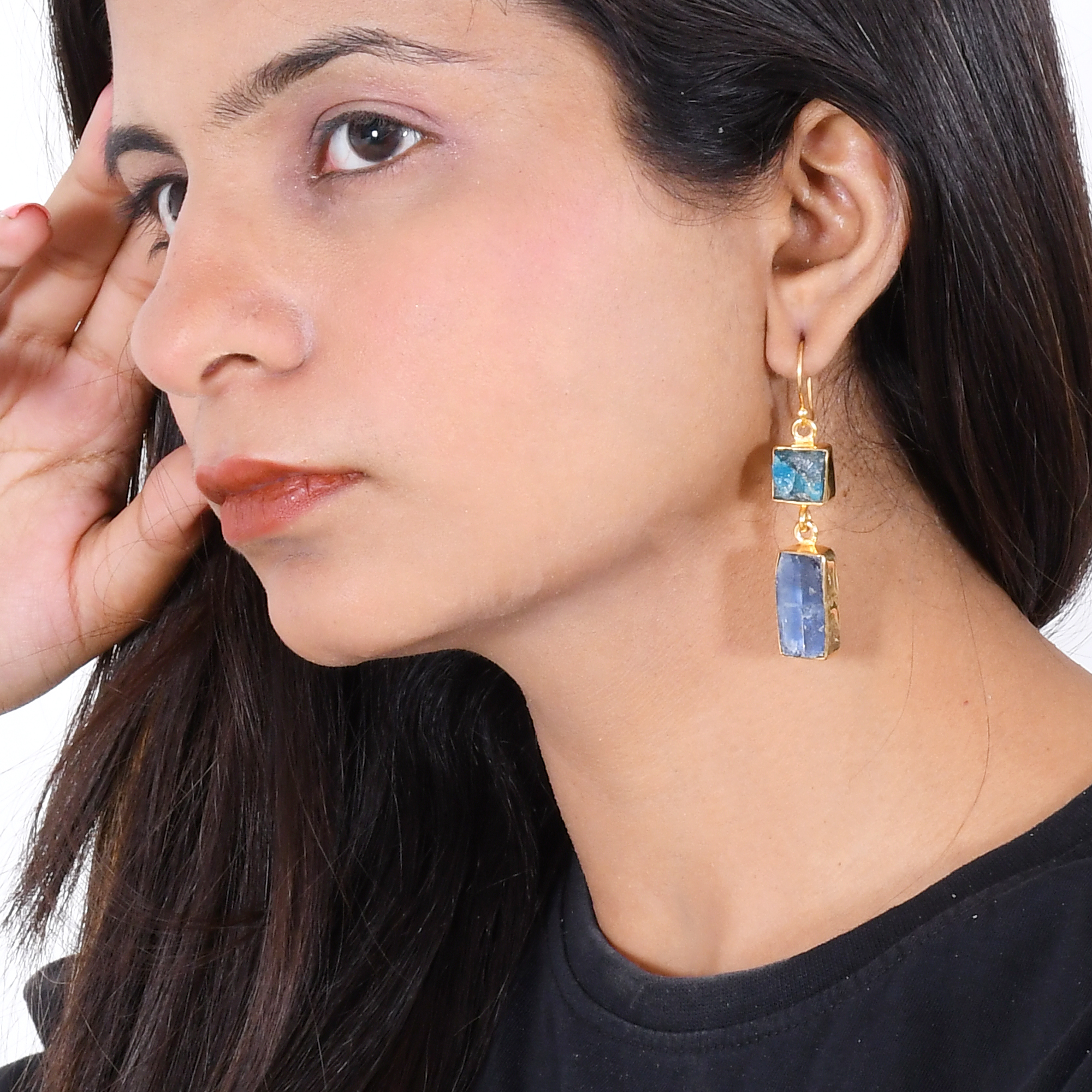 Unique christmas gift for the special lady with this uncut raw stone, 18k yellow gold plated hook dangle earrings. Handmade with blue kyanite and apatite, this stunning beauty makes for a refreshing look.