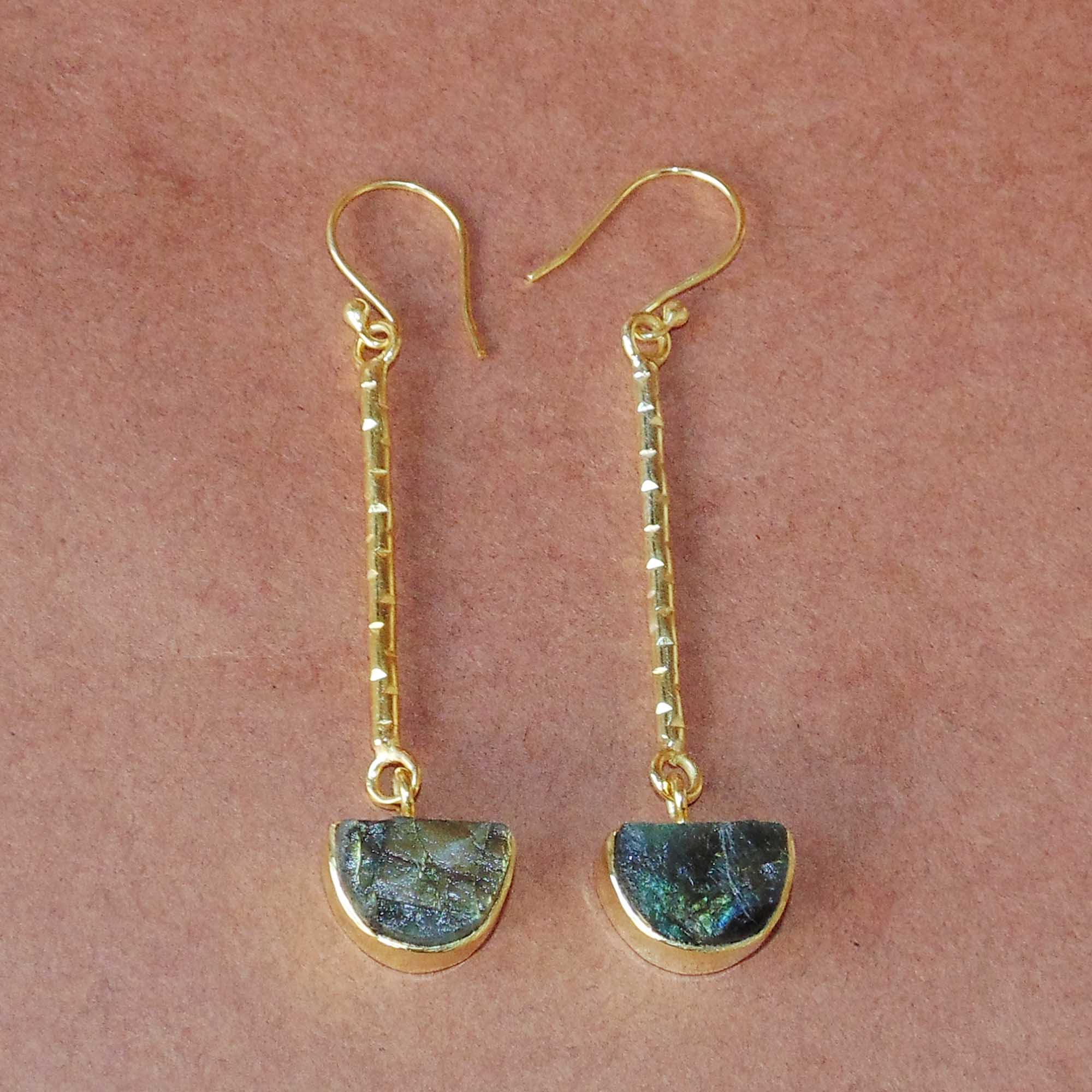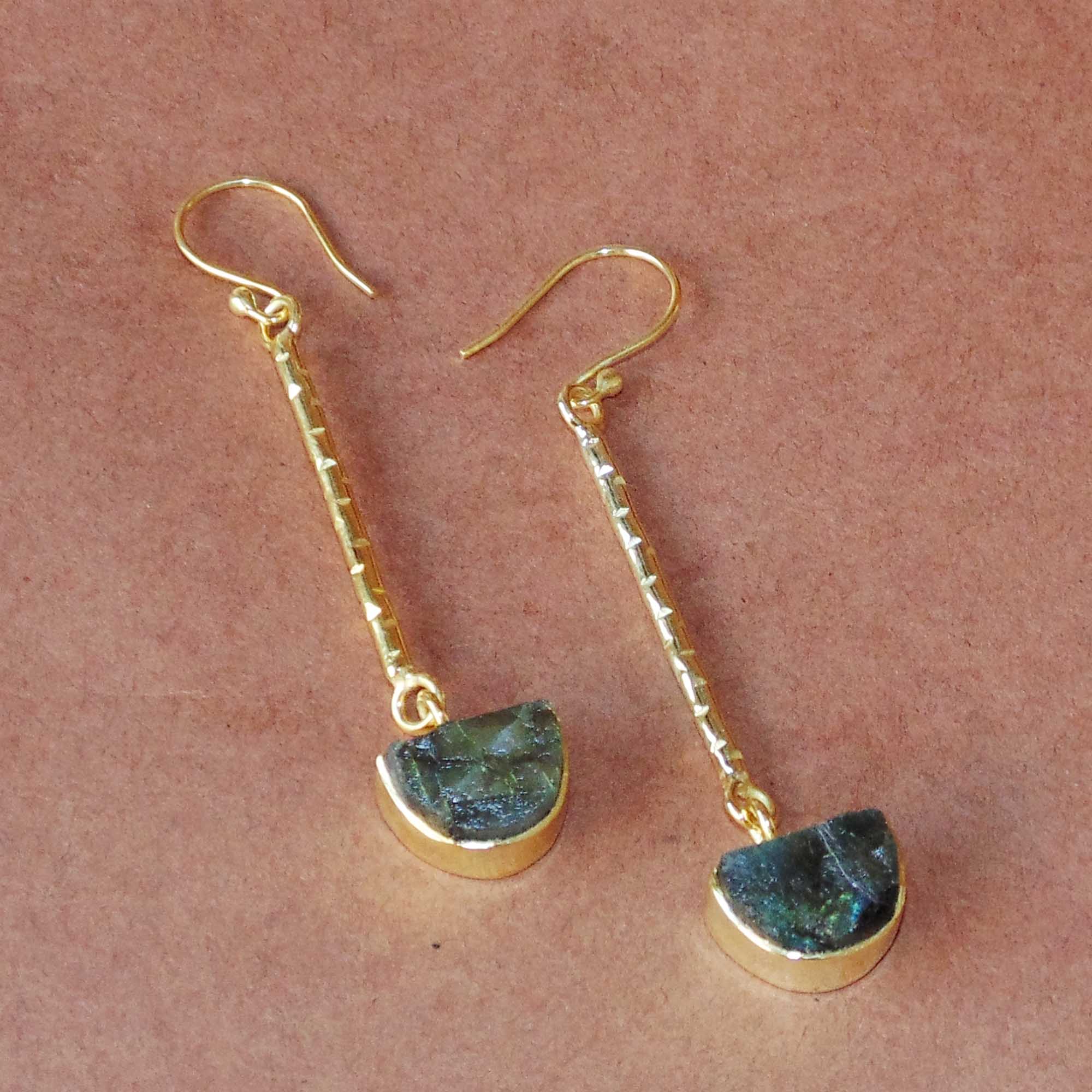 Lovely raw labradorite gemstones bezel set in 18k gold polished over brass make these handcrafted dangle earrings an easy choice for chic, inspired accessorizing.