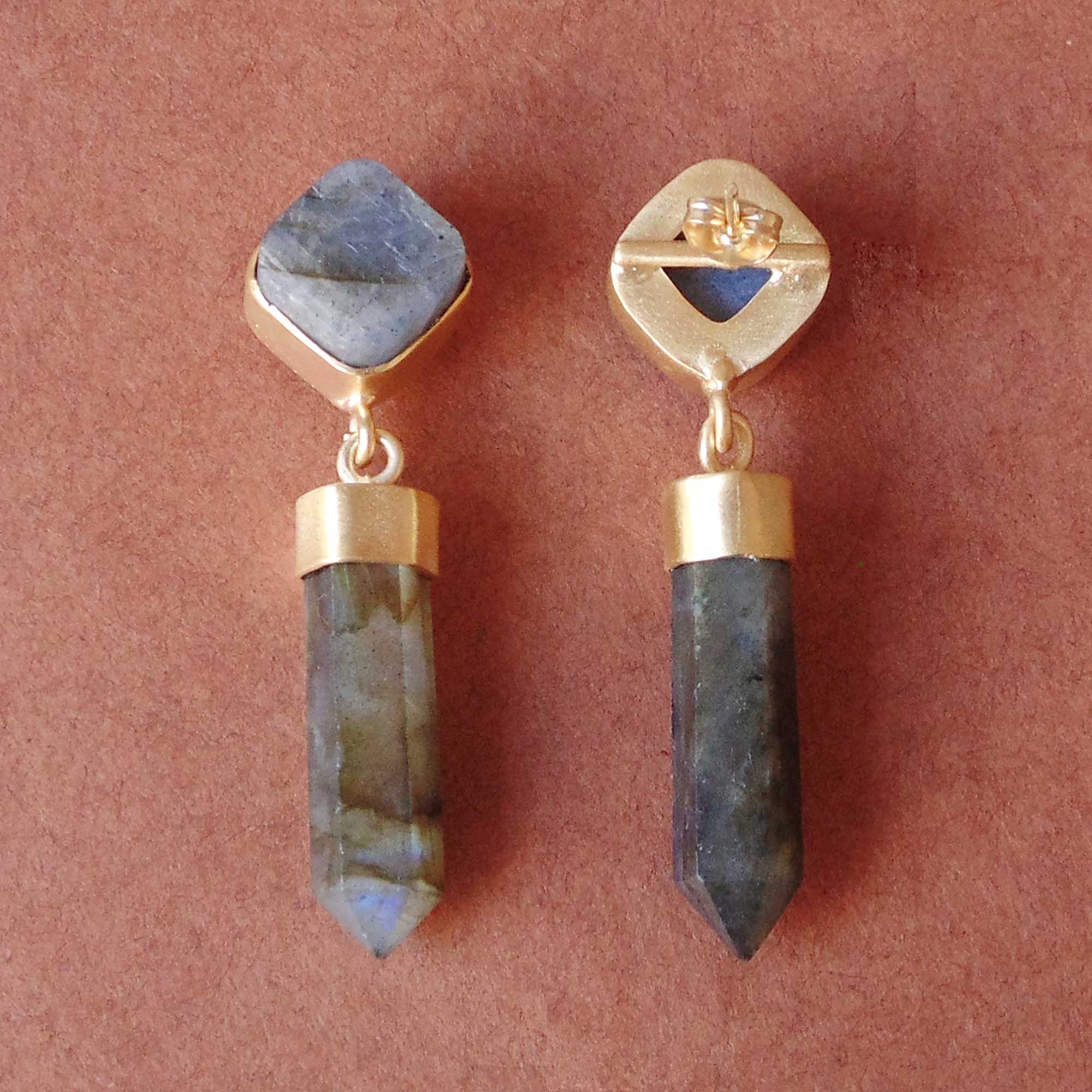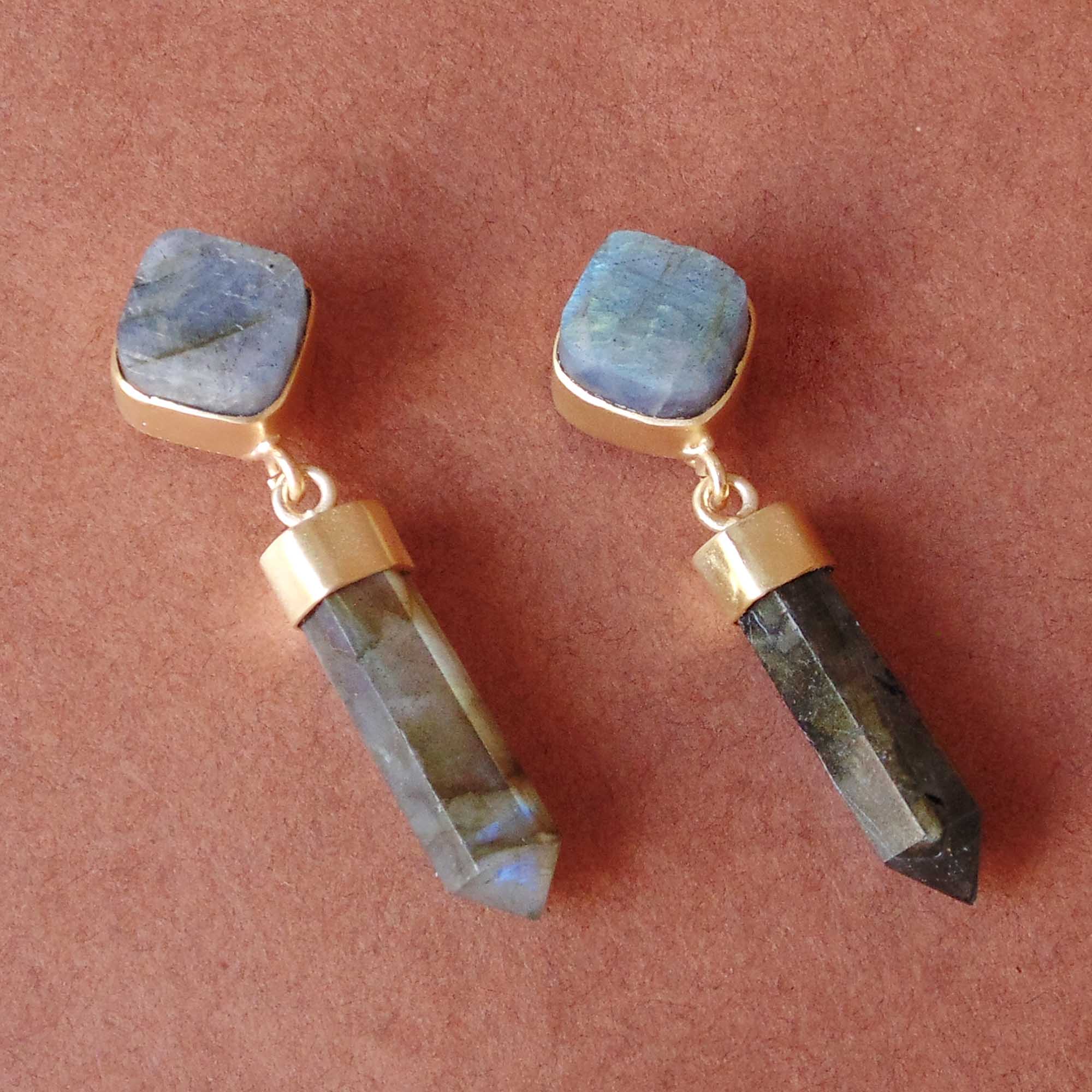 18K Gold Plated Raw Tanzanite And Pencil Shape Labradorite Gemstone Post Dangle Earrings