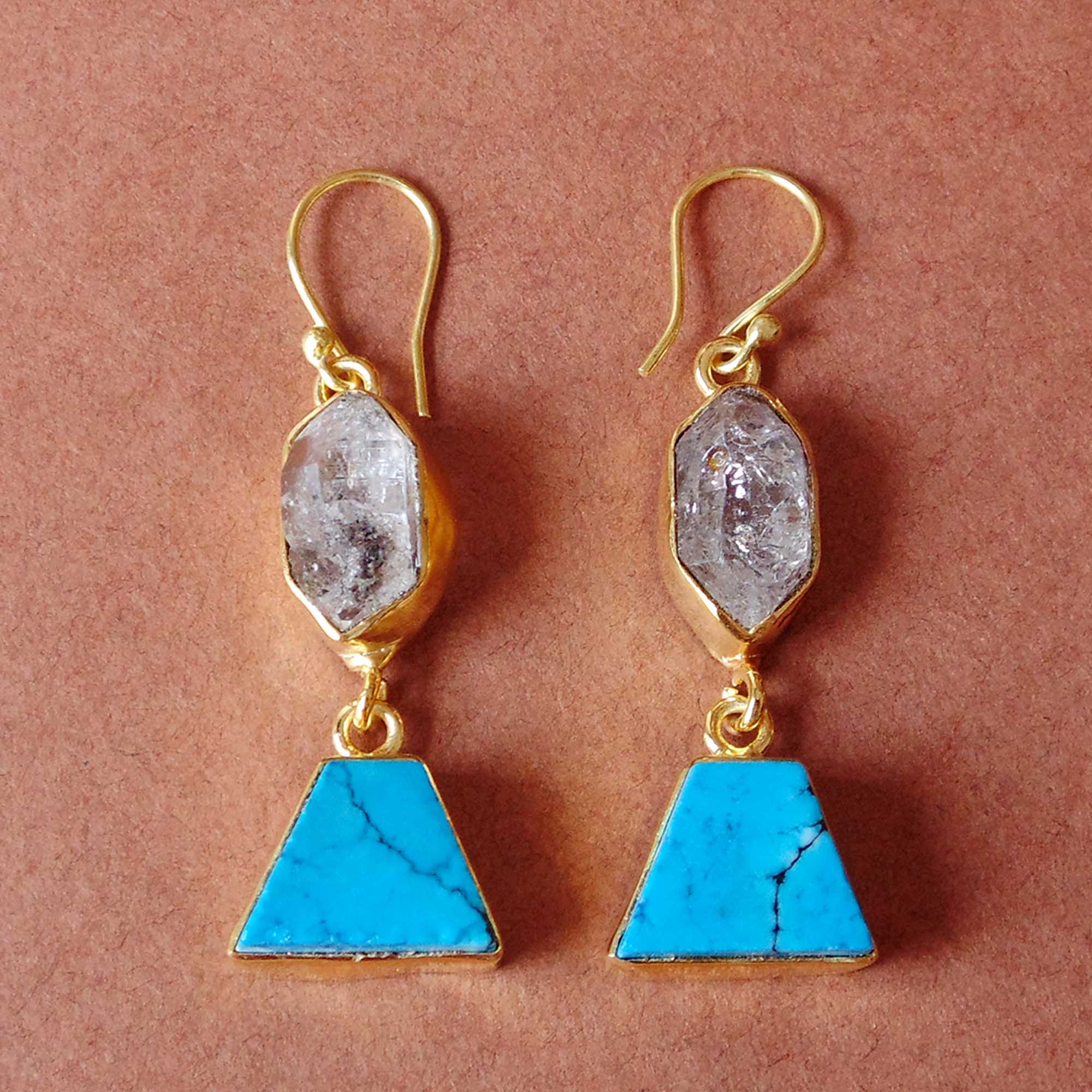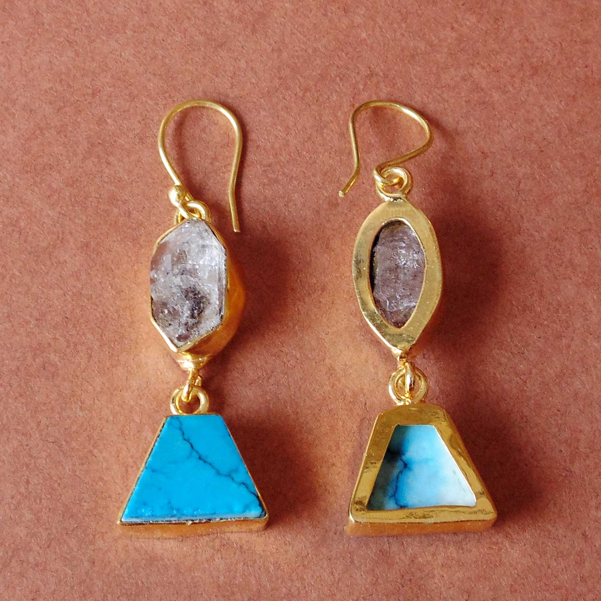 Natural Herkimer Diamond And Turquoise Gemstone Hook Dangle Earrings
