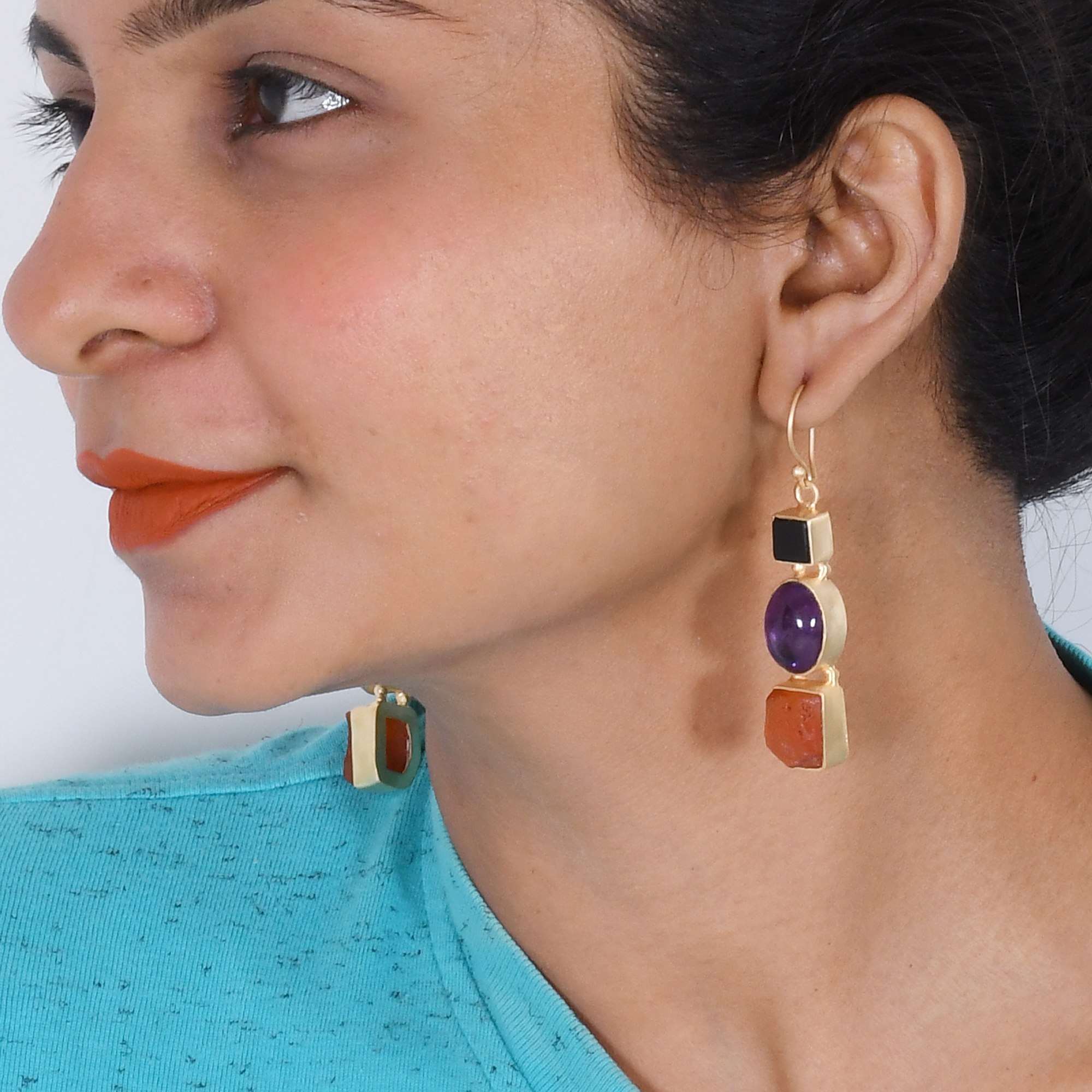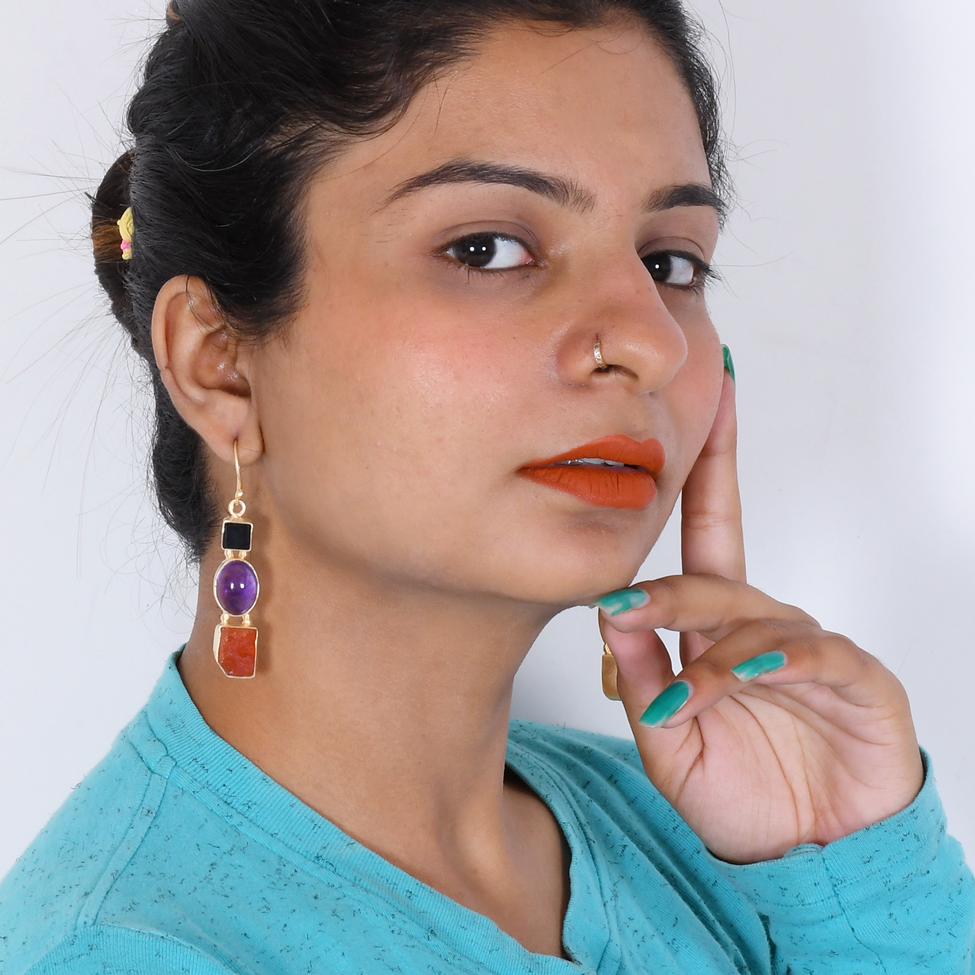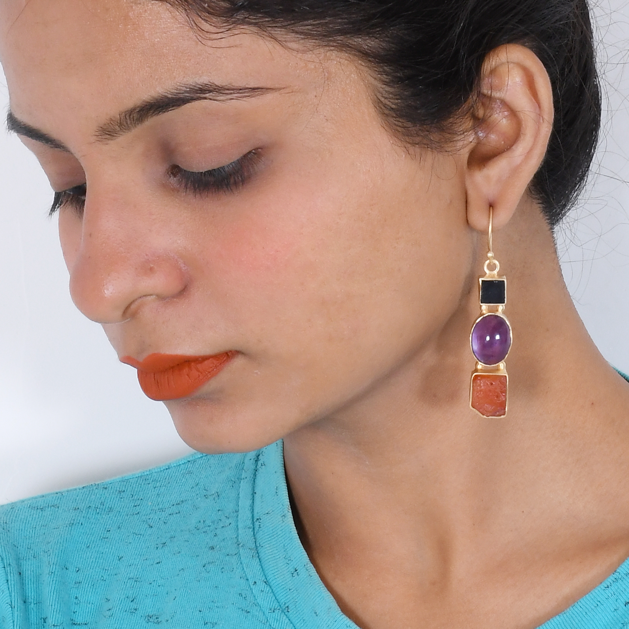 Our collections are made thoughtfully to reflect sustainability and artistry. For this design, we have chosen three stunning gemstones that make a lovely contrast. We have used rust-red carnelian at the bottom with purple amethyst and a black onyx at the top. The entire earring has been handcrafted using the finest quality brass and then gold plated to give it a flawless finish. Stunning earrings perfect for everyday use.