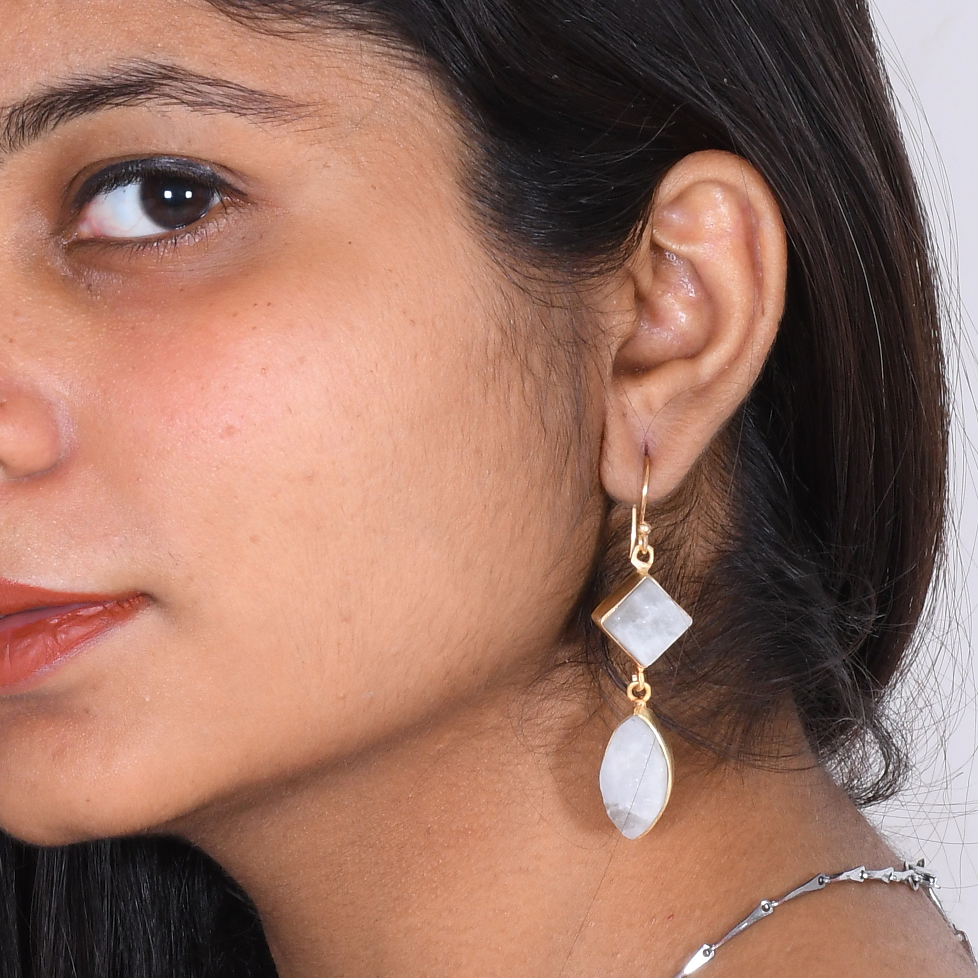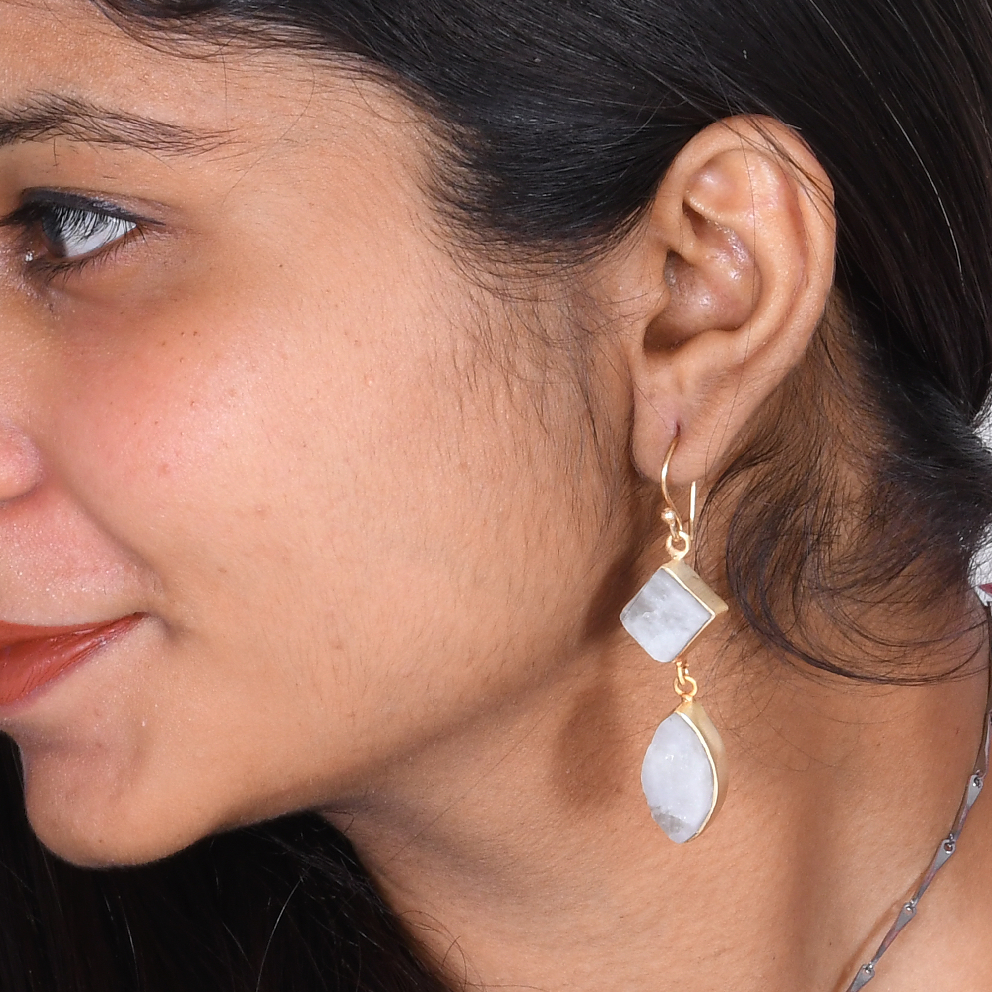 Iridescence hue of the raw moonstone earring captures interest immediately. The subtle beauty is enhanced by the handcrafted gold-plated metal detailing. We always ensure to maintain the quality of our products and give importance to create stunning jewellery that will never go out of style.