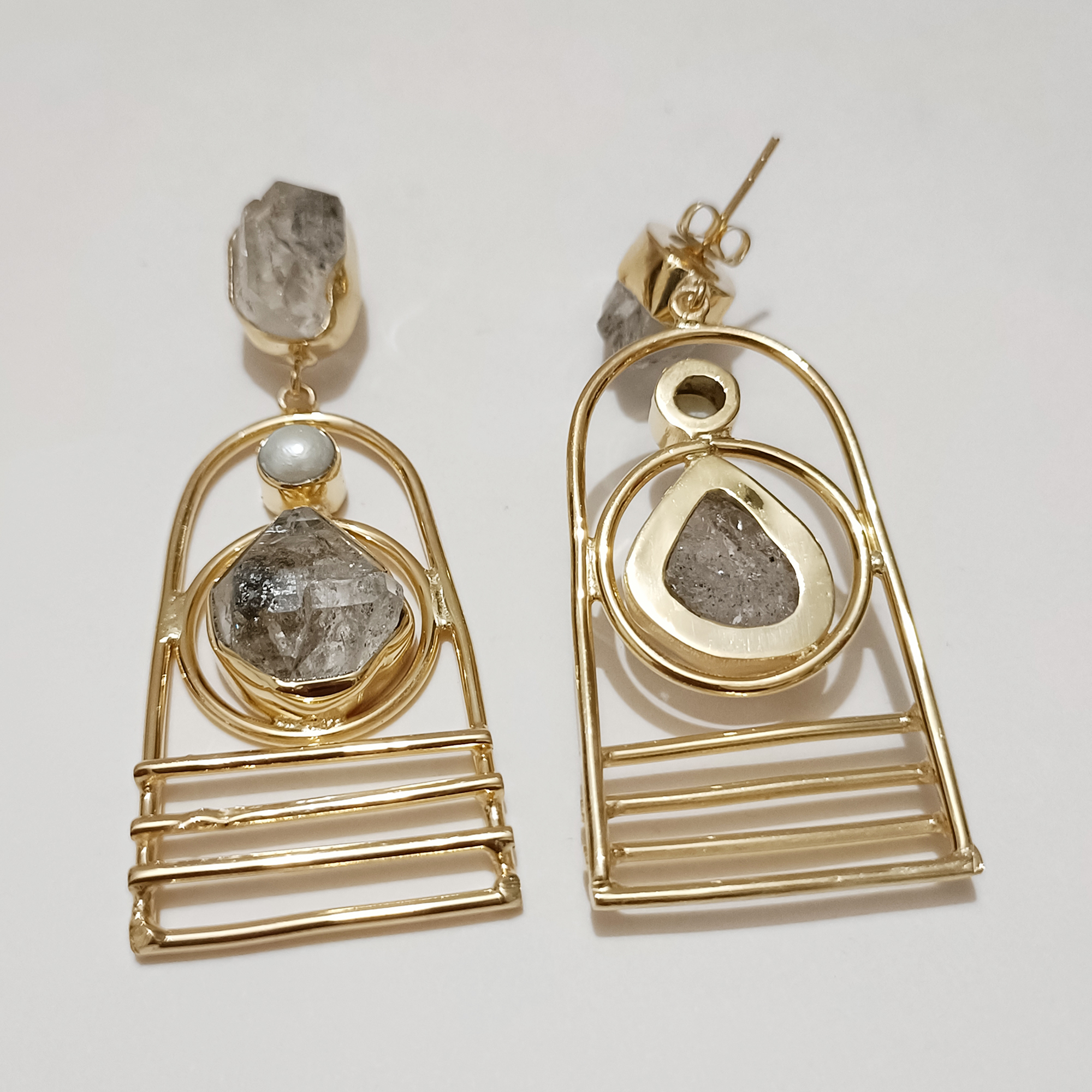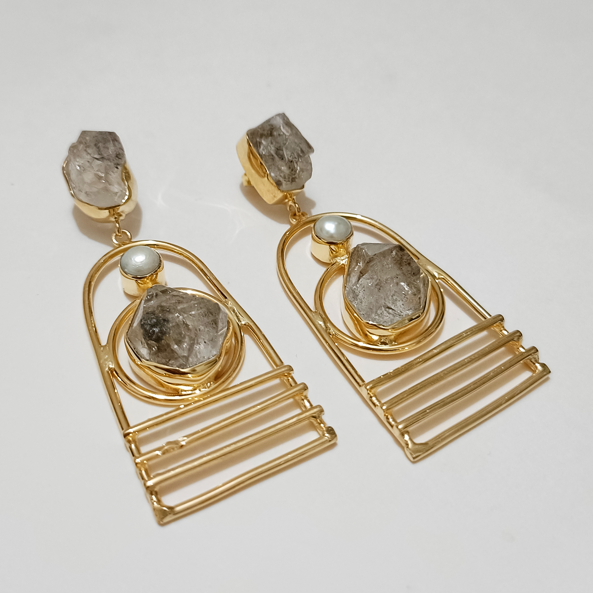 Artisan Made In 18K Gold Plated Herkimer Diamond And Pearl Statement Earrings