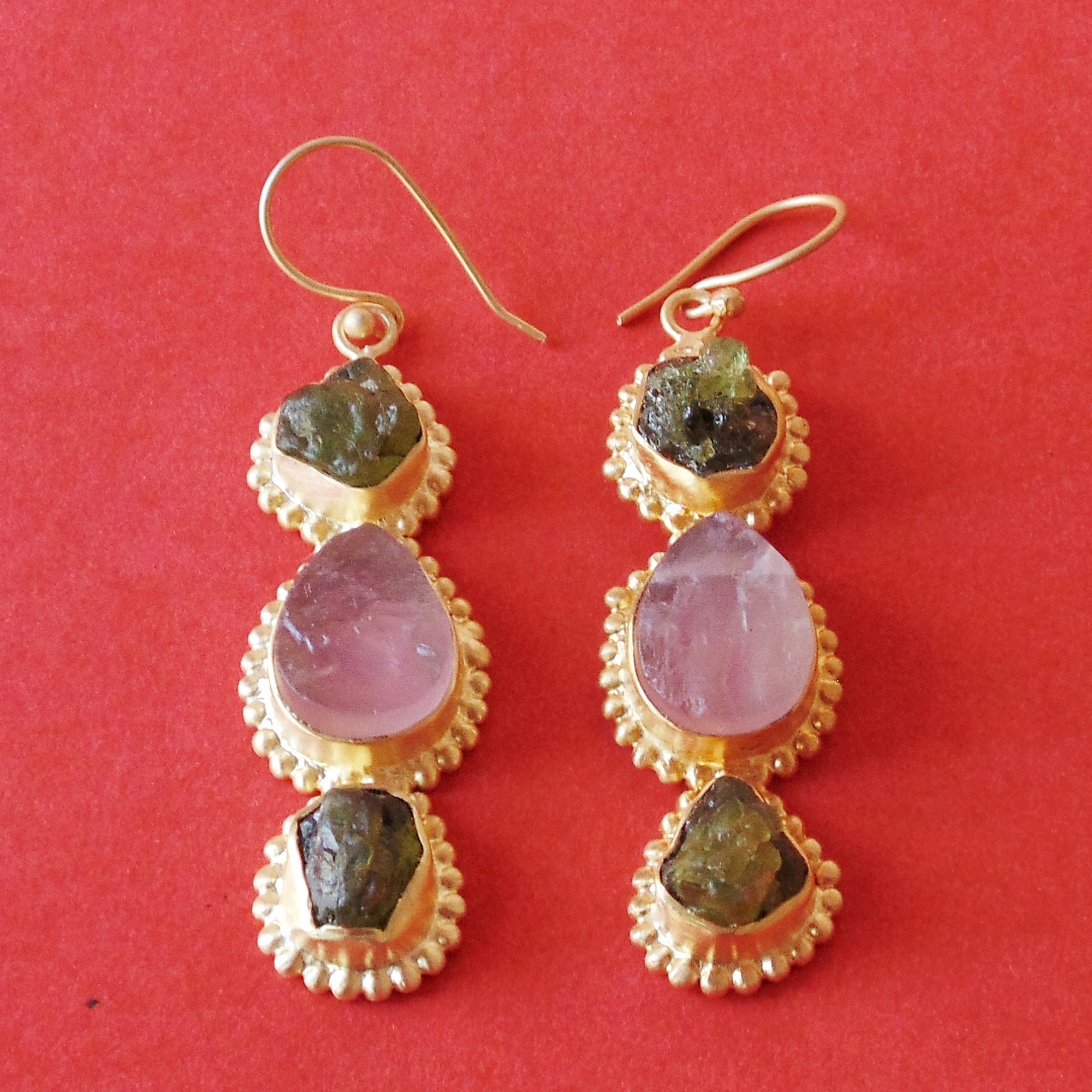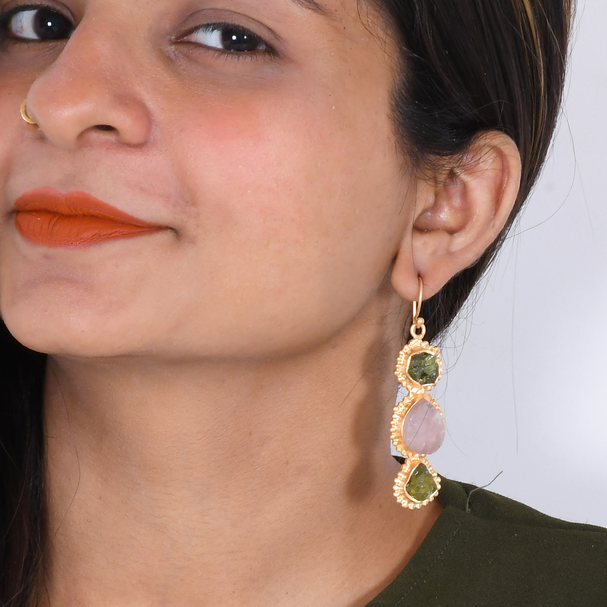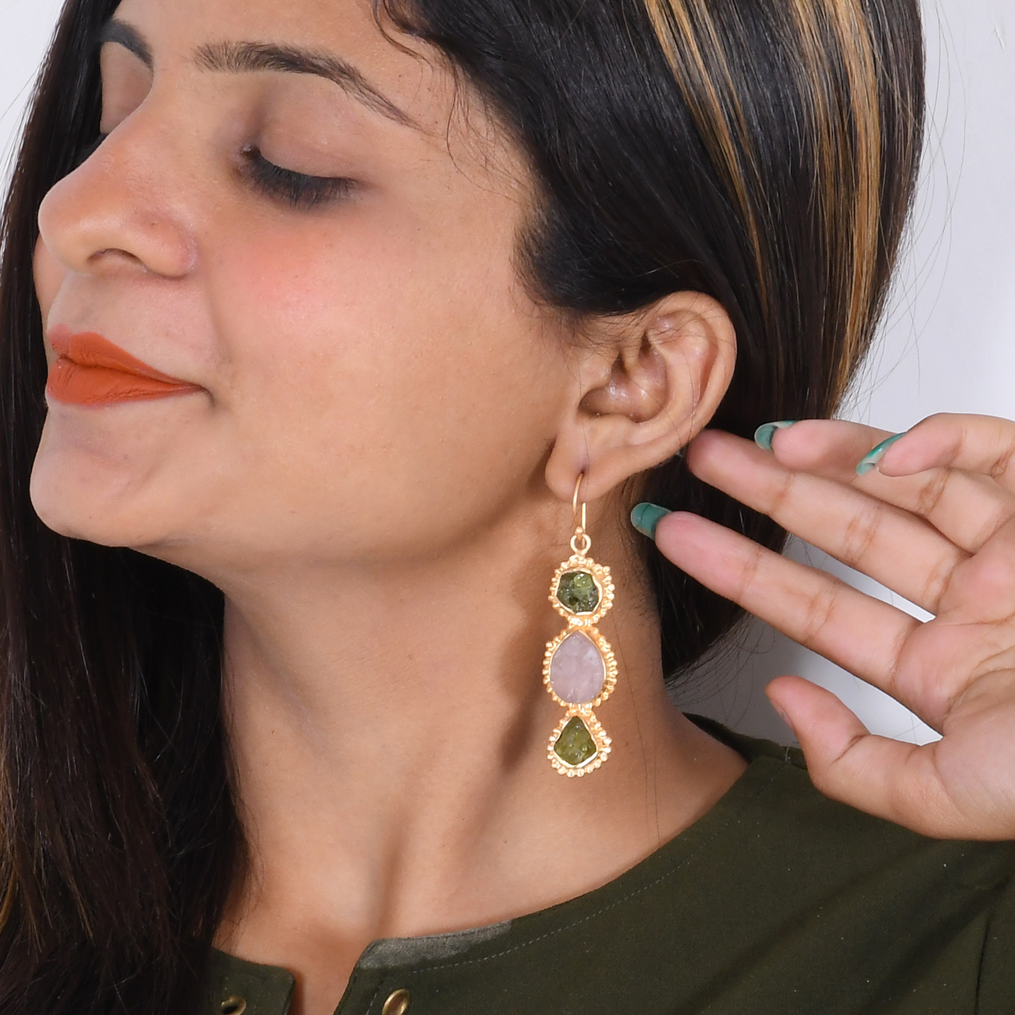 Handcrafted Natural Peridot And Rose Quartz Gemstone Bohemian Earrings
