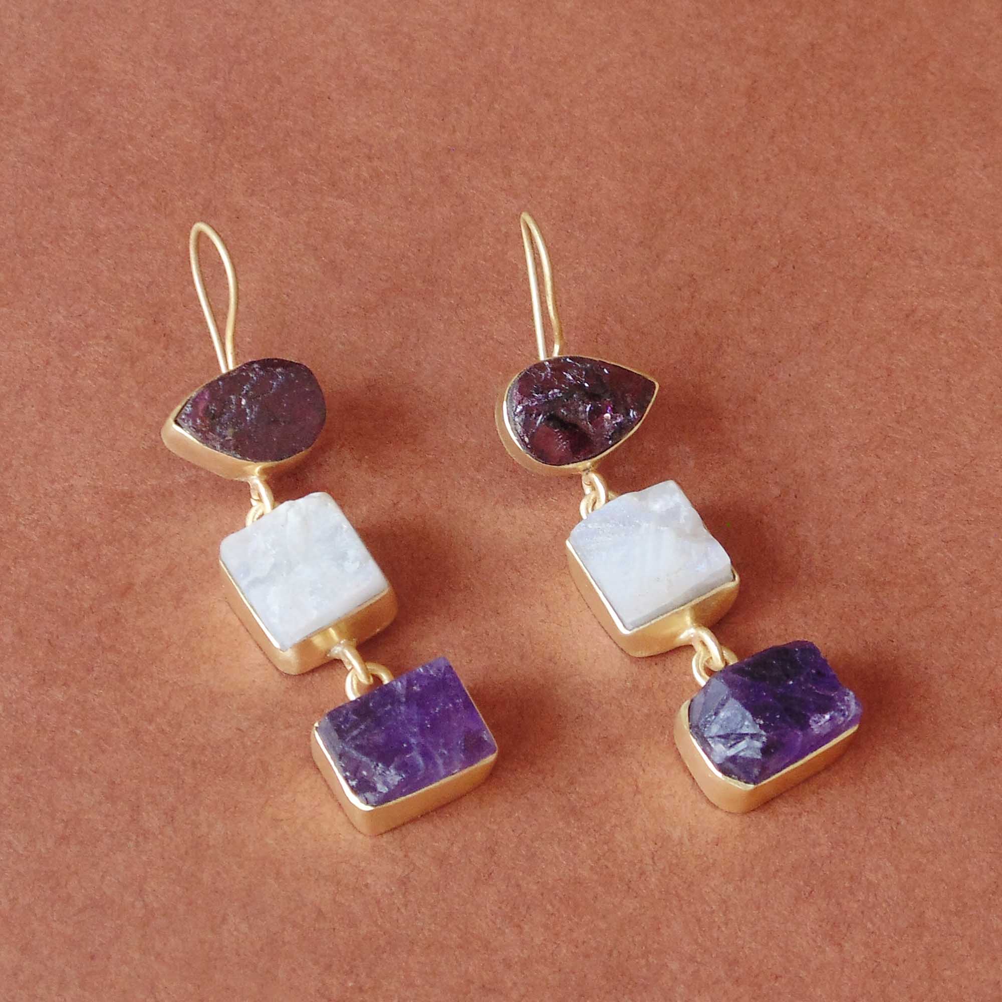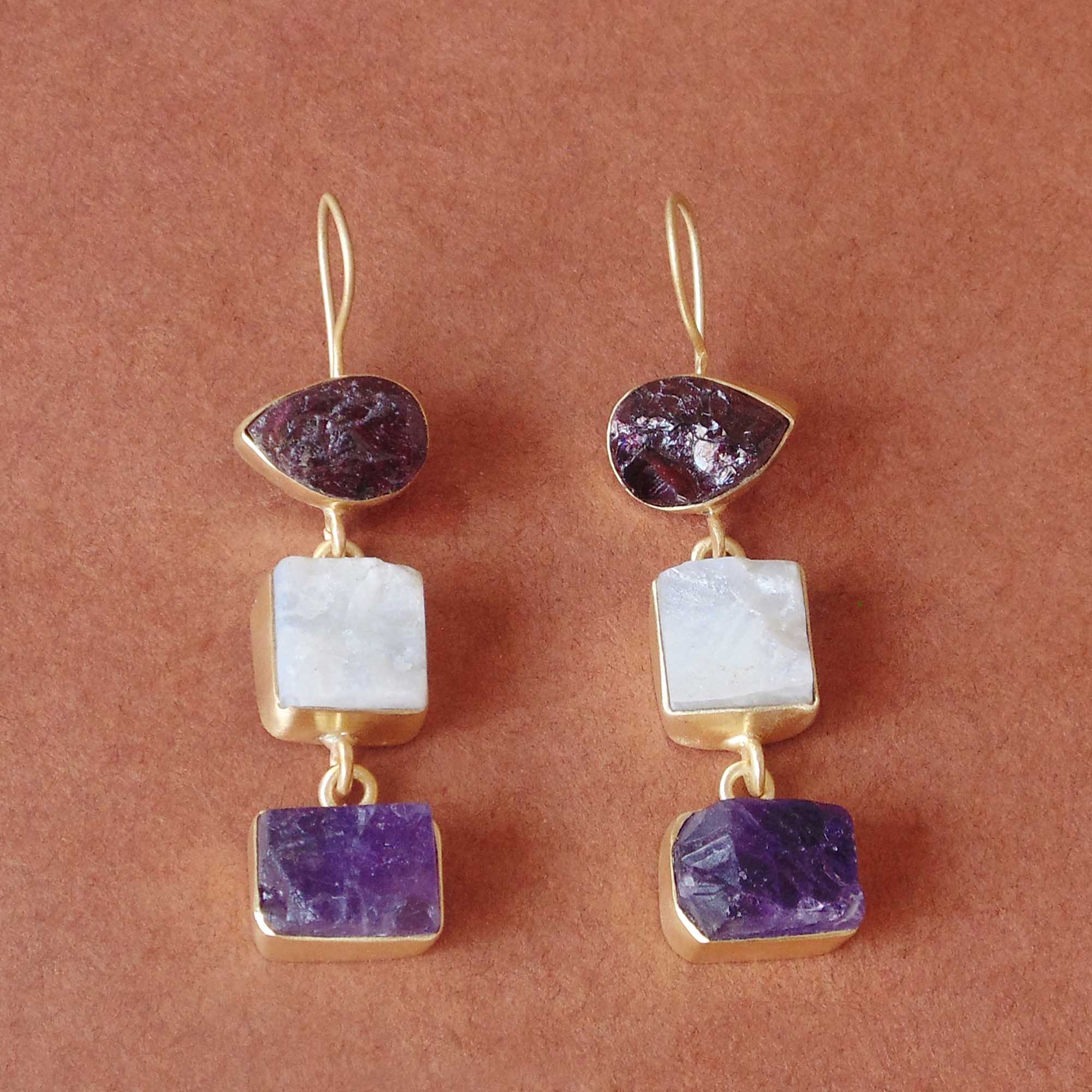 Handmade garnet, Rainbow Moonstone And Amethyst Gemstone Bridesmaids Earrings